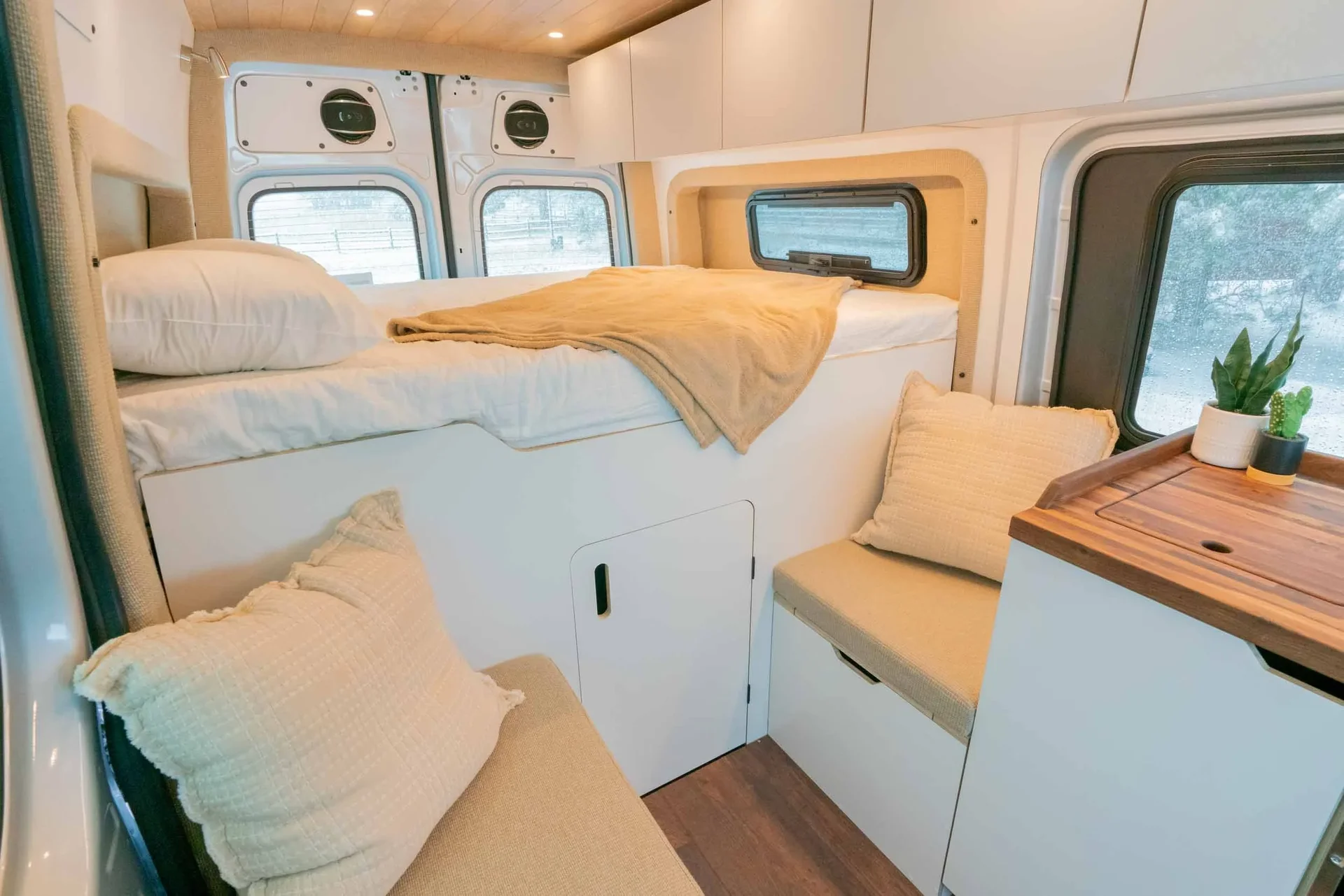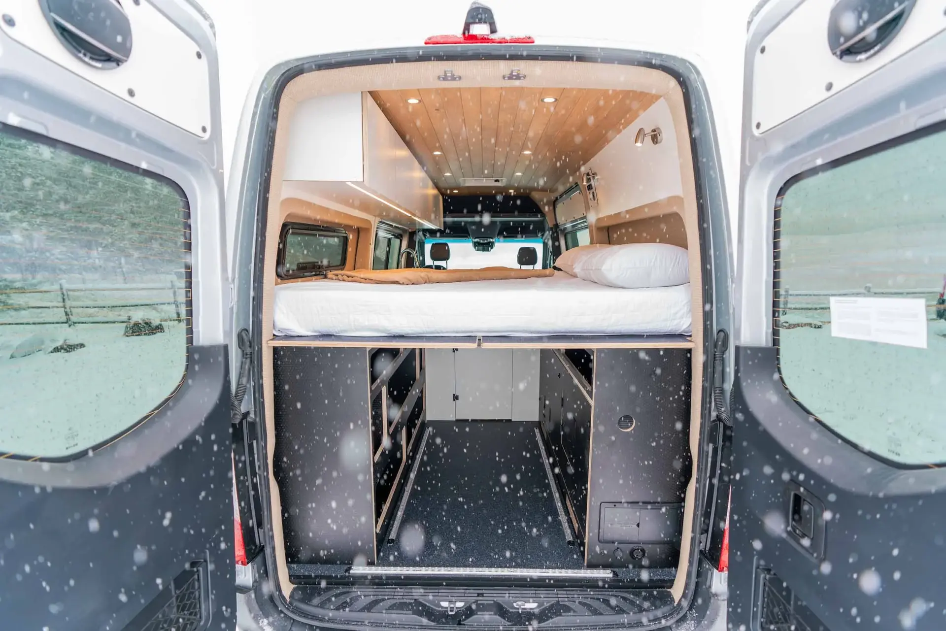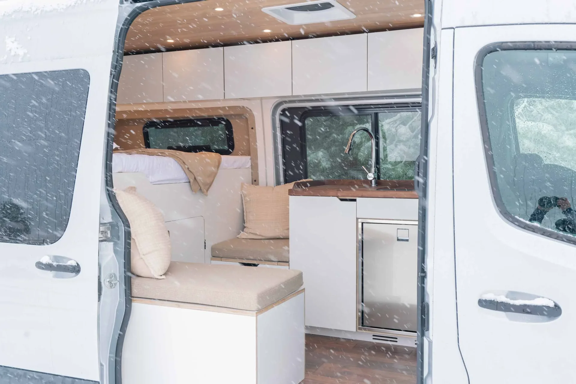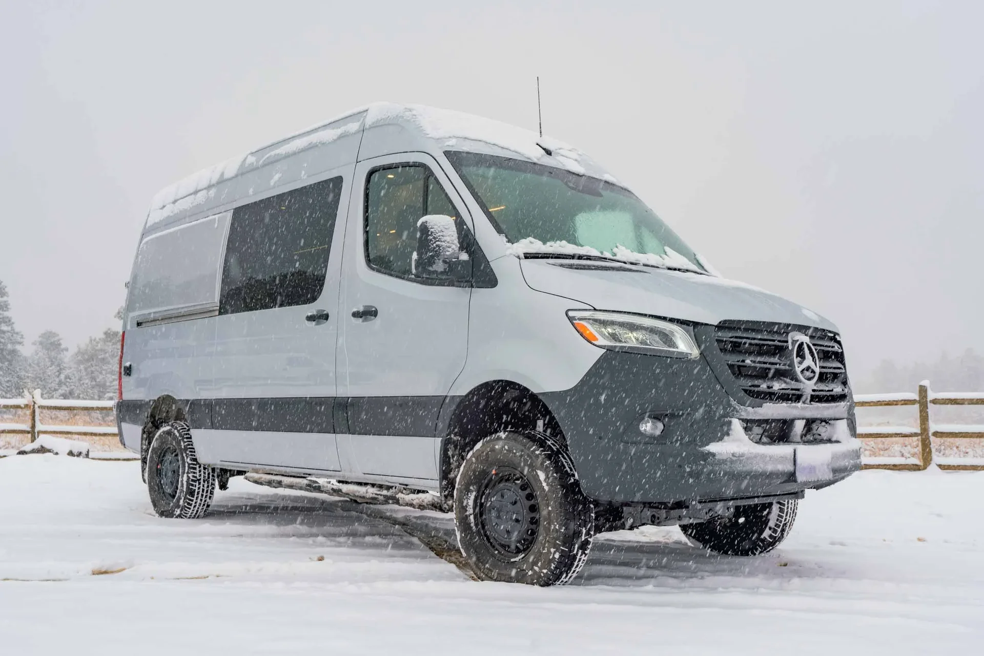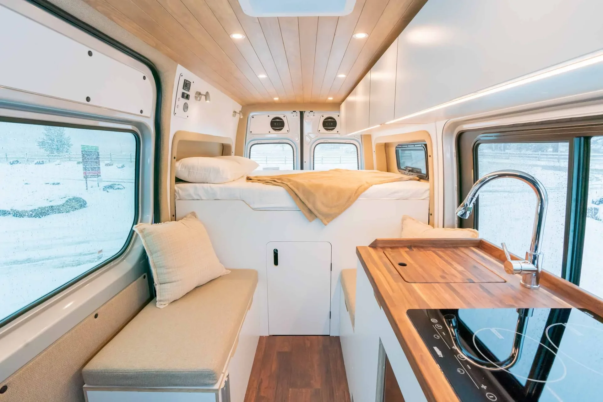A 2023 Mercedes-Benz Sprinter 144" AWD conversion featuring warm-toned luxury finishes — oiled walnut countertops, a custom-finished tongue-and-groove ceiling, and elegant interior lighting. Equipped with a secondary 255-amp alternator charging system and Bluetooth/cellular monitoring for robust off-grid capability.