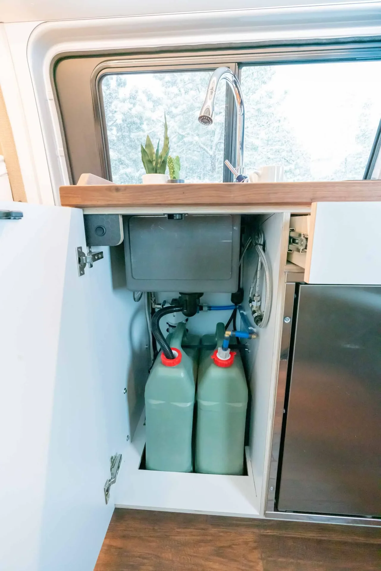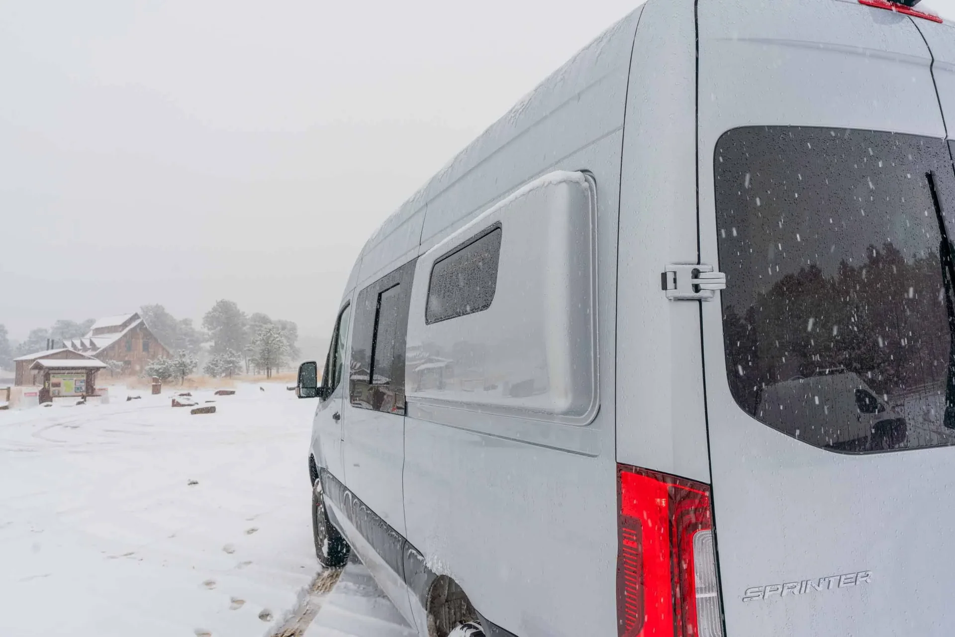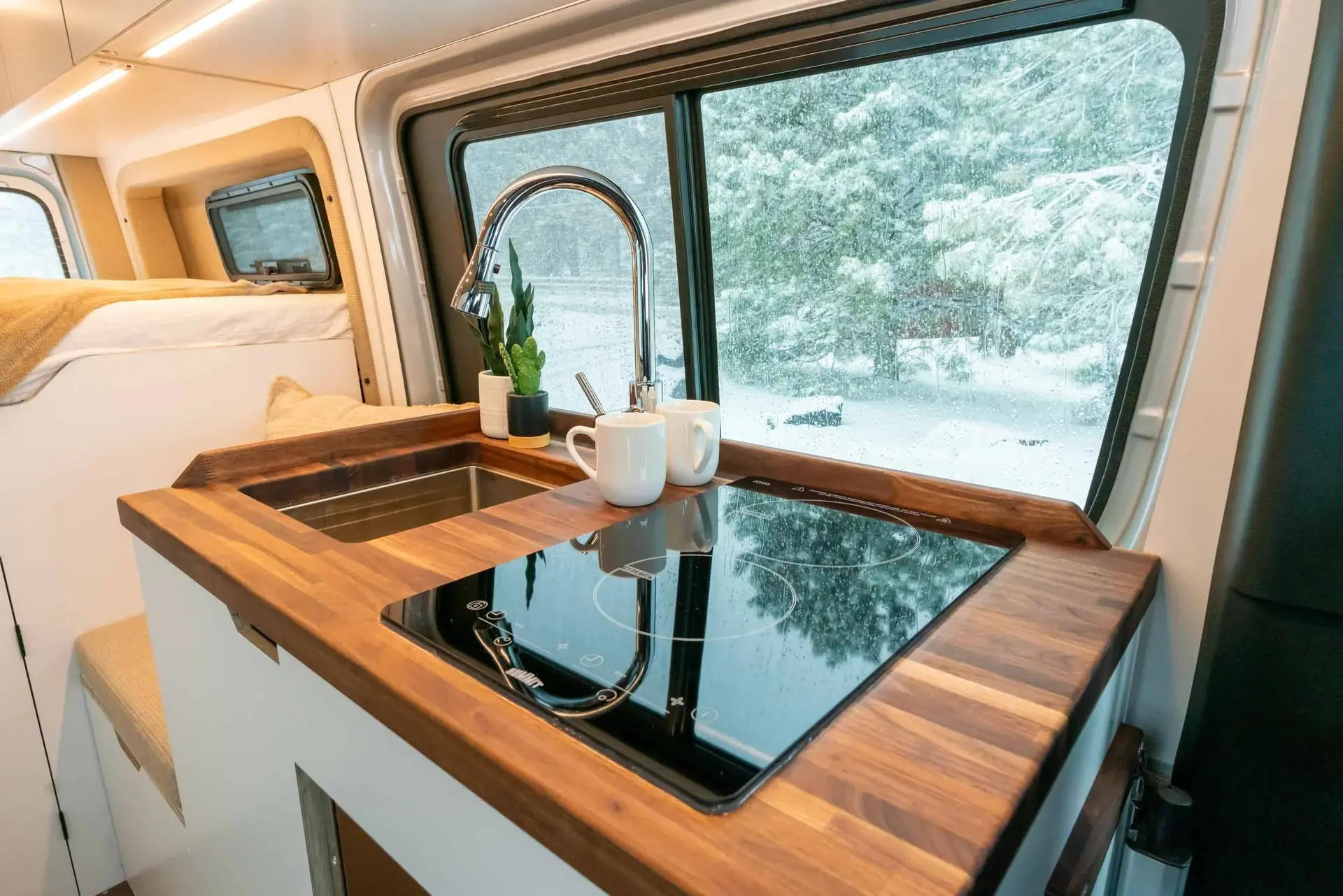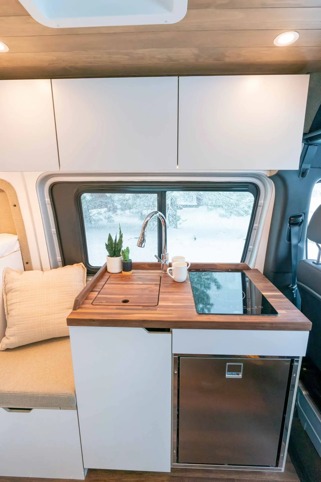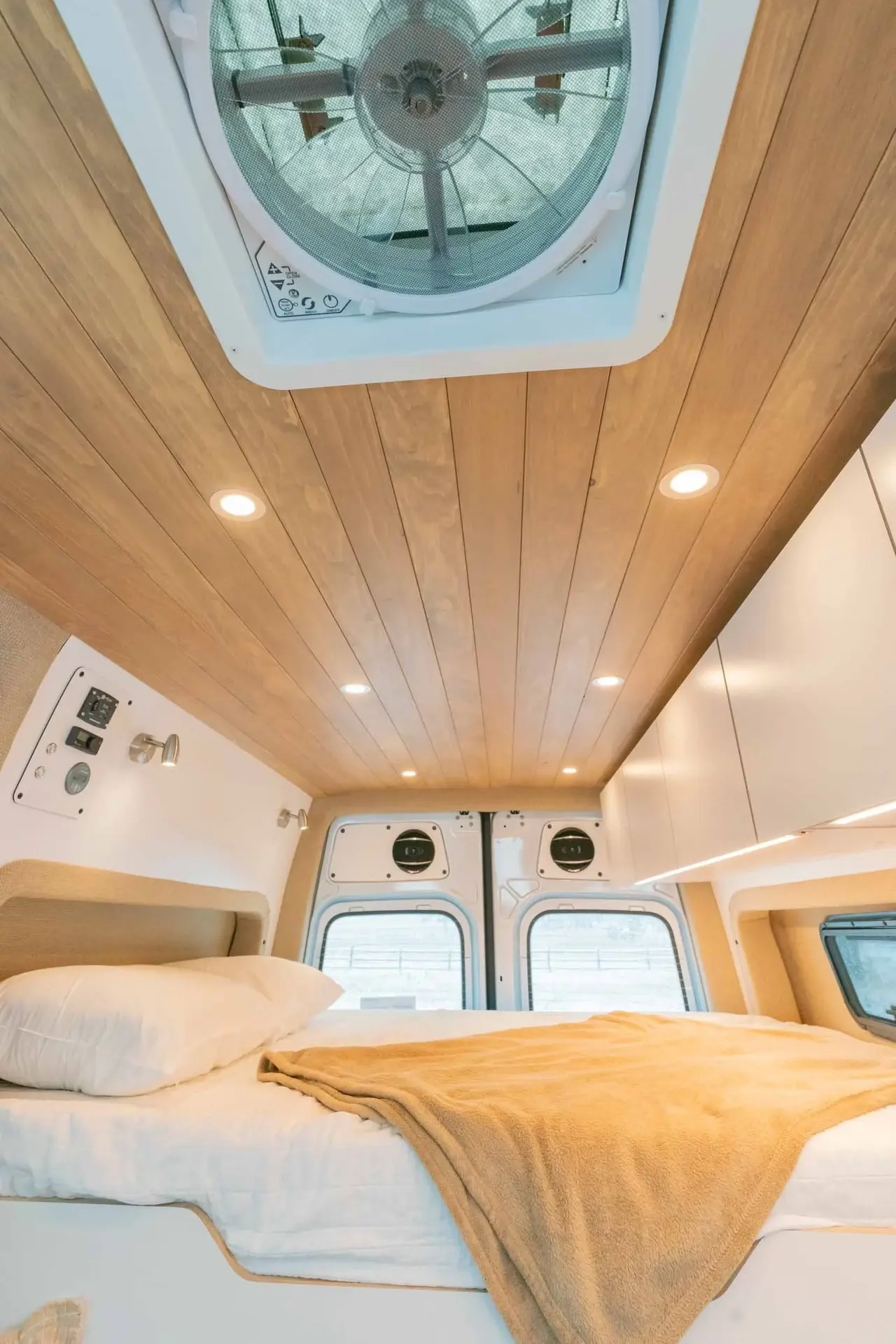 A 2023 Mercedes-Benz Sprinter 144" AWD conversion featuring warm-toned luxury finishes — oiled walnut countertops, a custom-finished tongue-and-groove ceiling, and elegant interior lighting. Equipped with a secondary 255-amp alternator charging system and Bluetooth/cellular monitoring for robust off-grid capability.