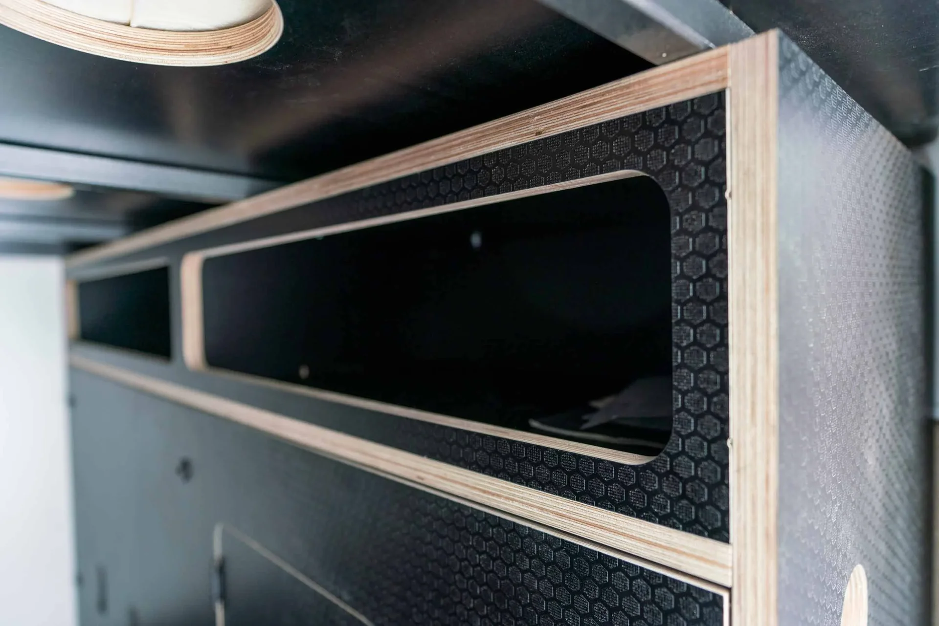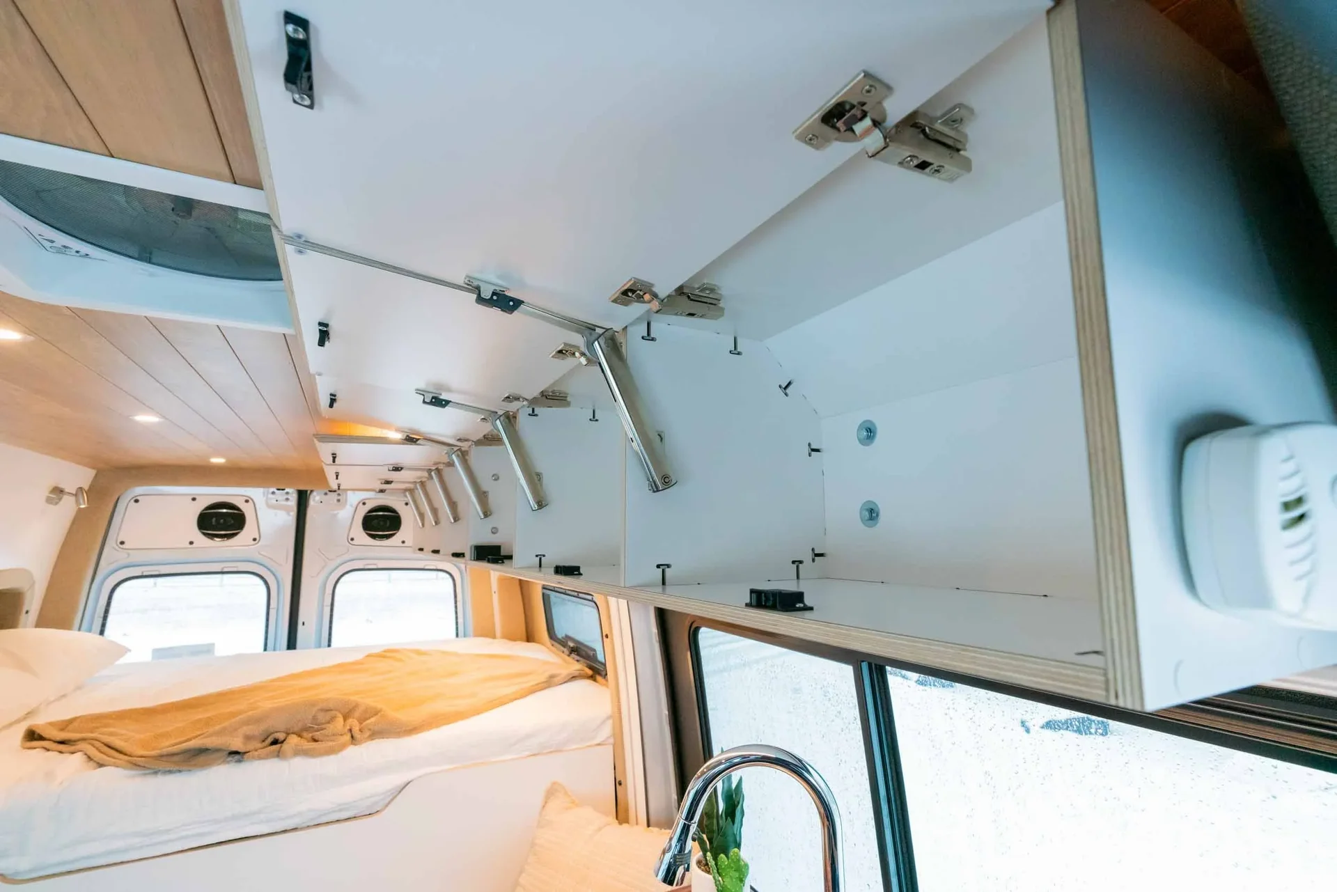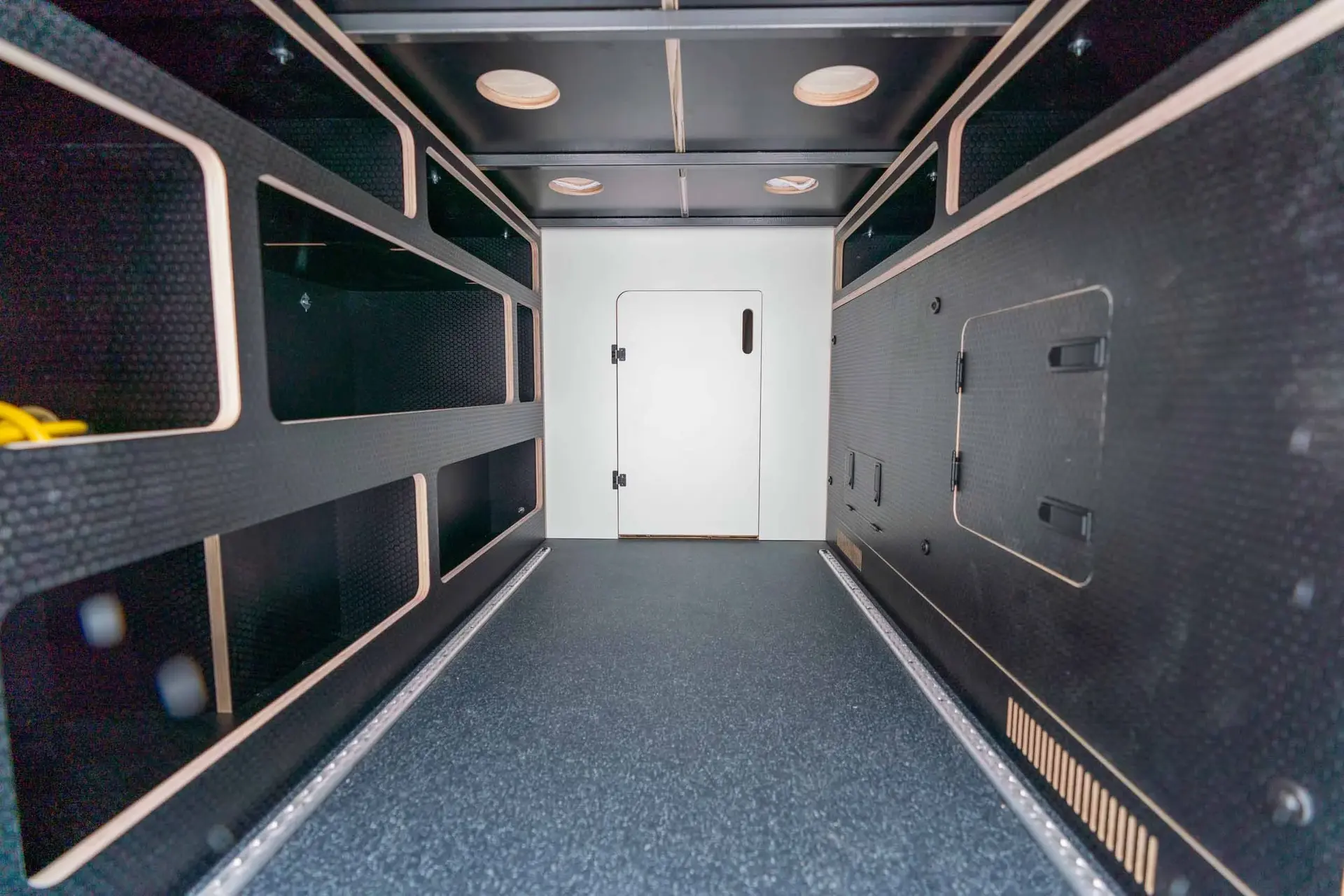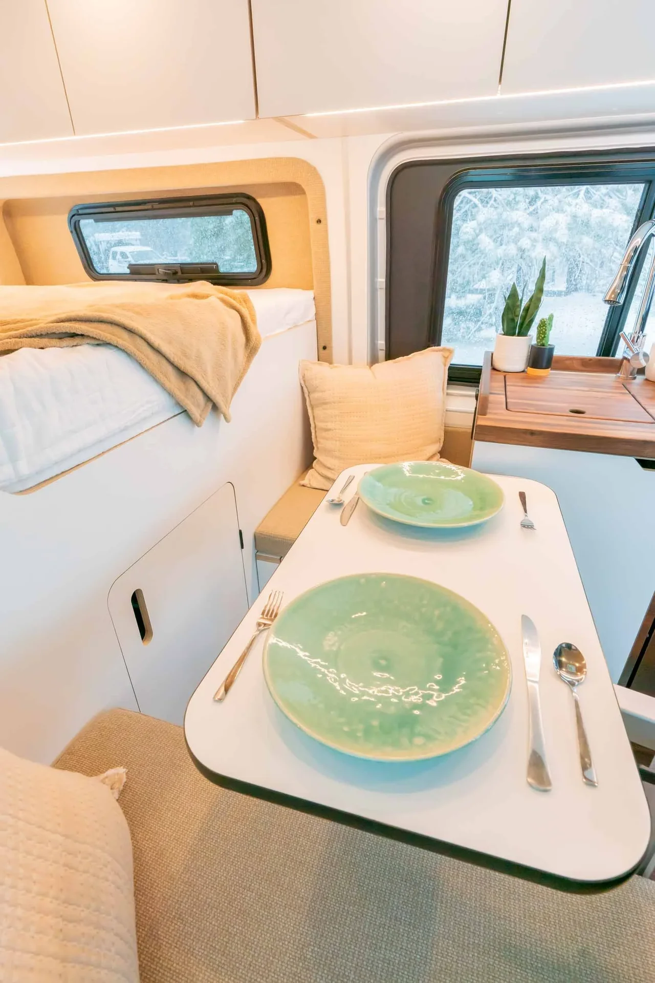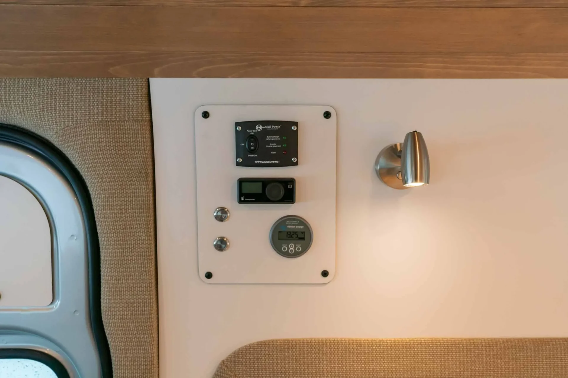Oiled walnut countertops. Custom-finished T&G ceiling. Driver-side upper cabinets with under-cabinet lighting. Fold-down exterior table. Dimmable multi-zone puck lighting. Over-bed reading lights. Pass-through bulkhead wall. Secondary 255-amp alternator charging. Bluetooth and cellular monitoring.