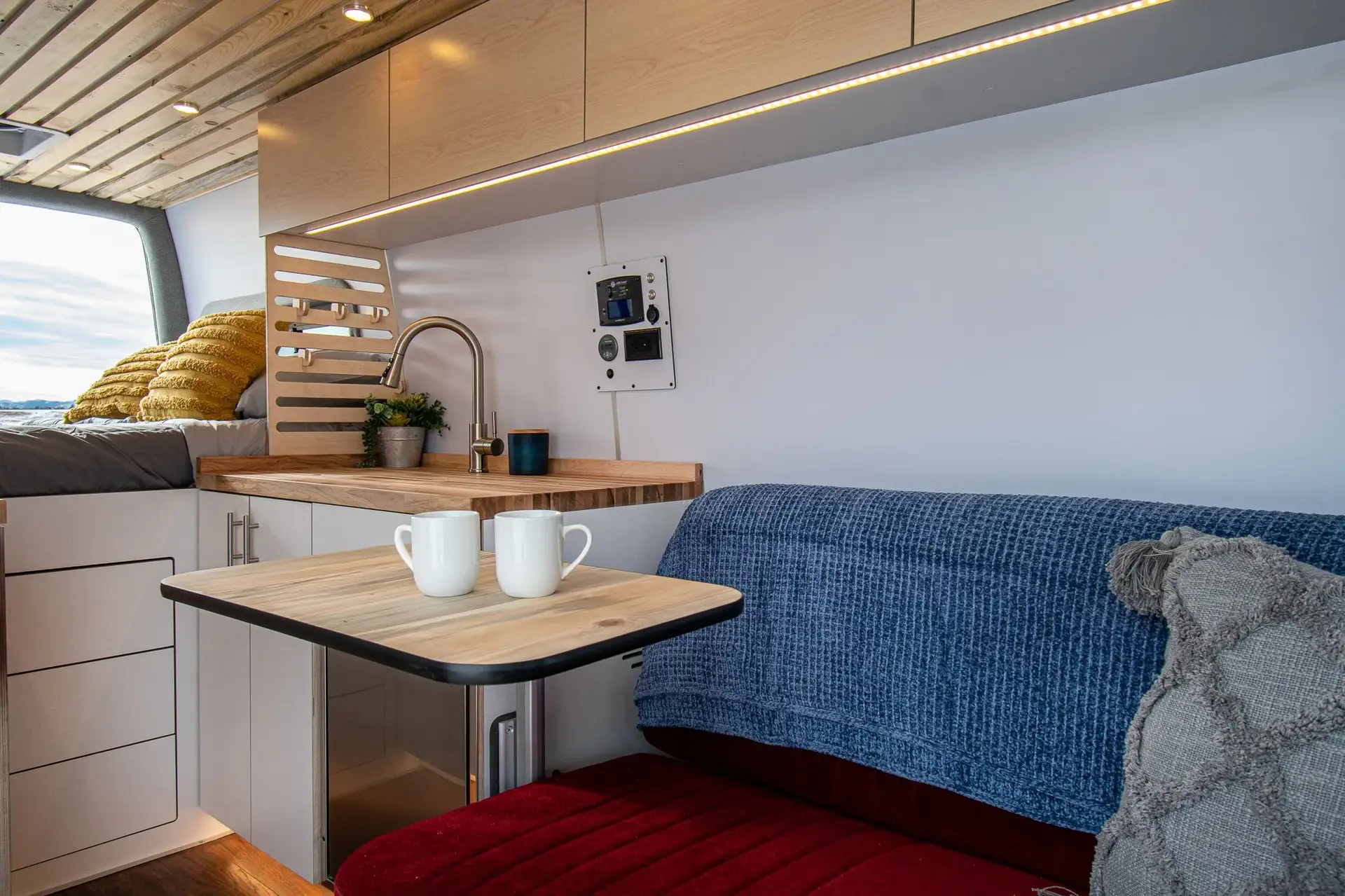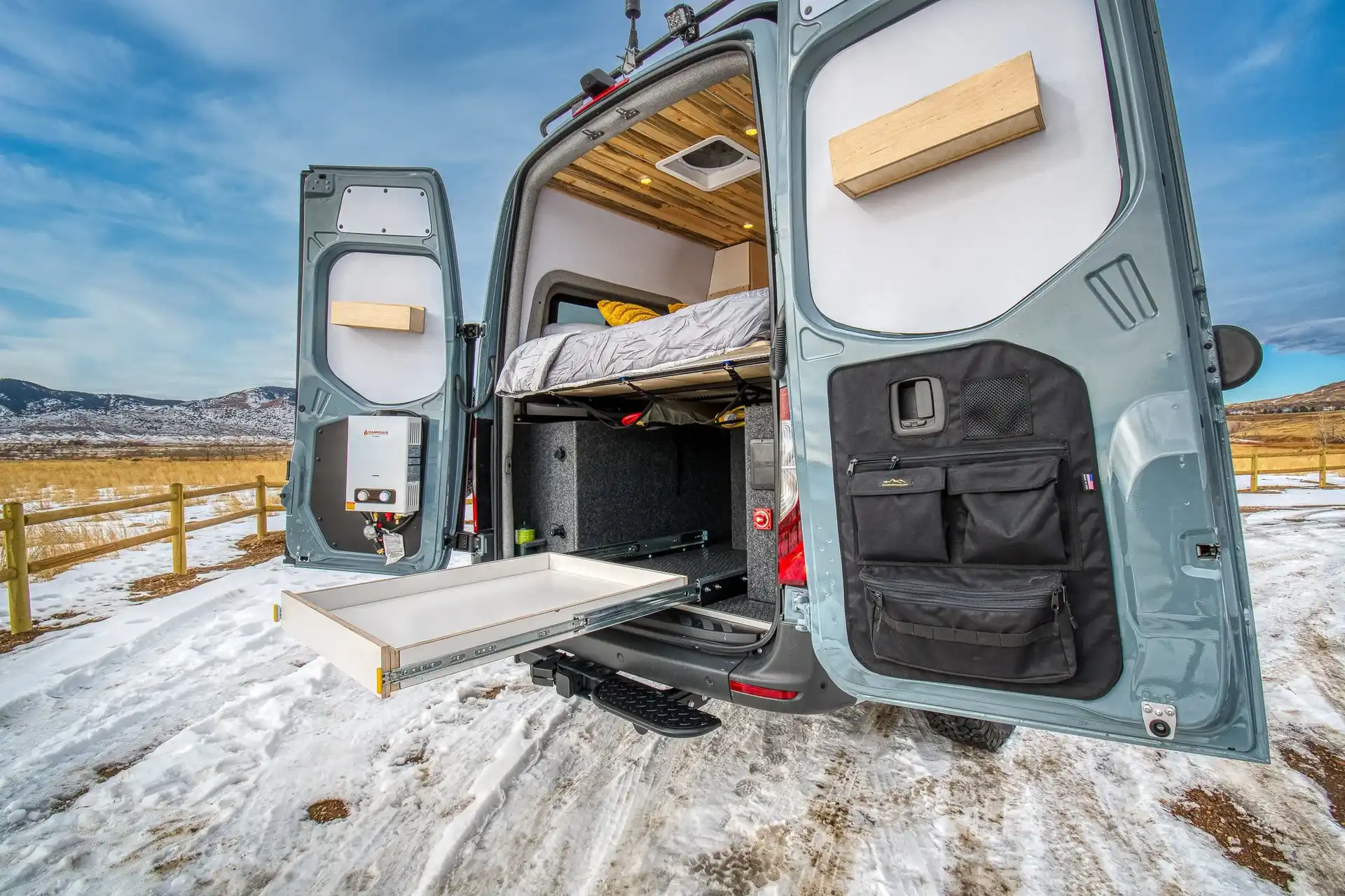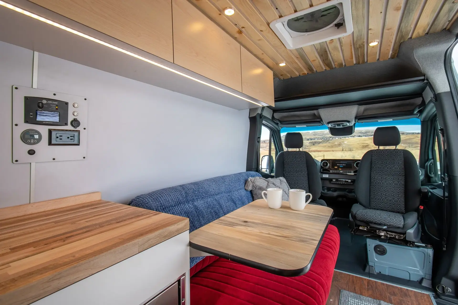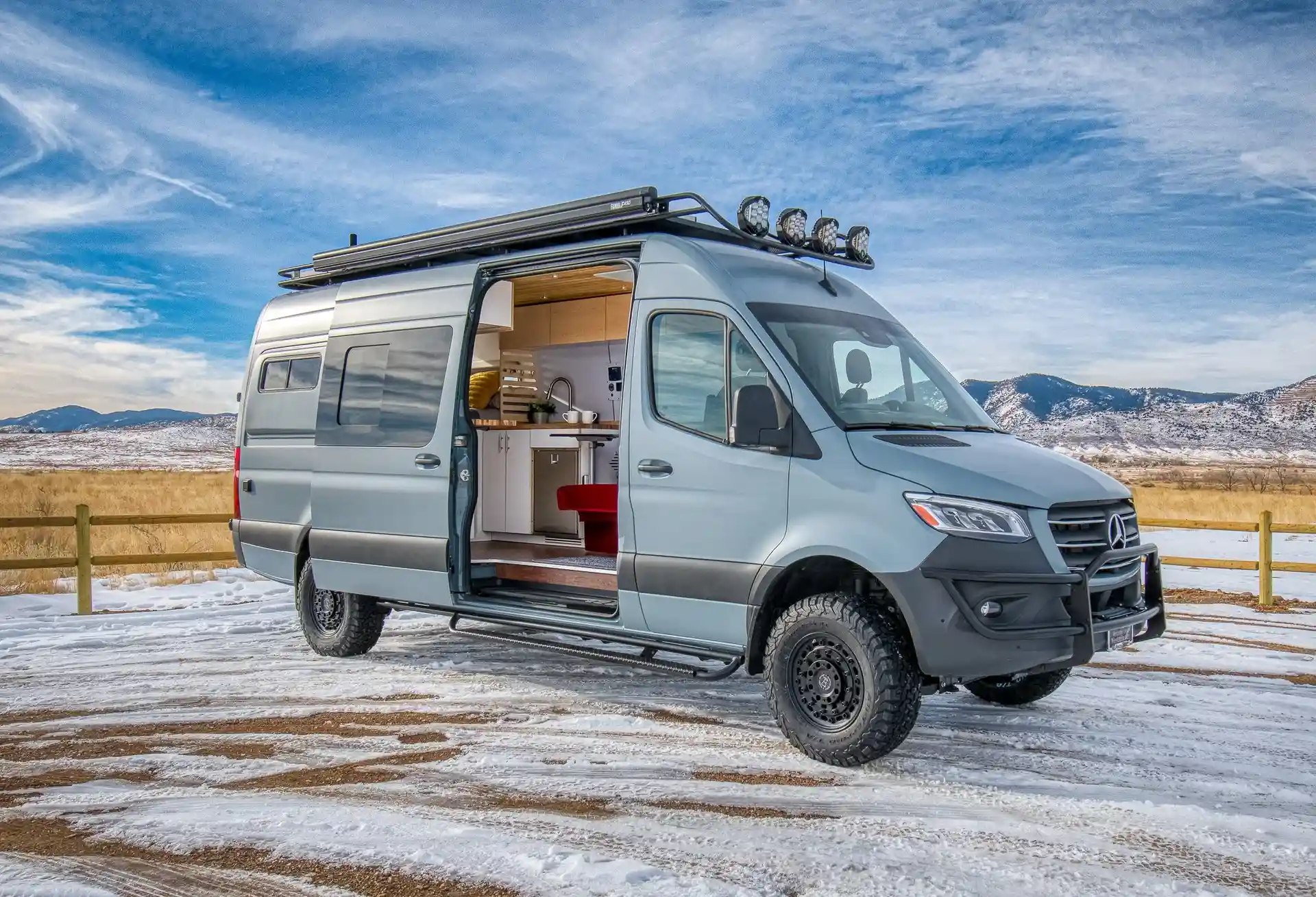 A 2021 Mercedes Sprinter 170" 4x4 packed with amenities and upgrades that are both stylish and functional. Notable features include a red sofa bed, slide-out cargo drawer, Baja Designs LP9 off-road lighting, a matte vinyl wrap, and Van Compass Stage 4 suspension. Dual kitchenettes on both driver and passenger sides provide maximum prep flexibility.