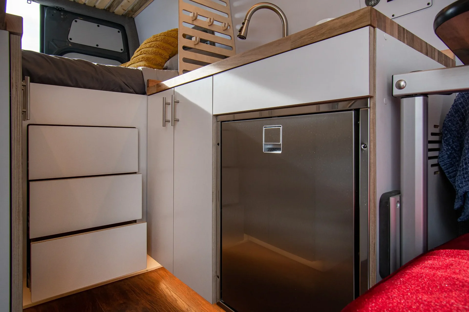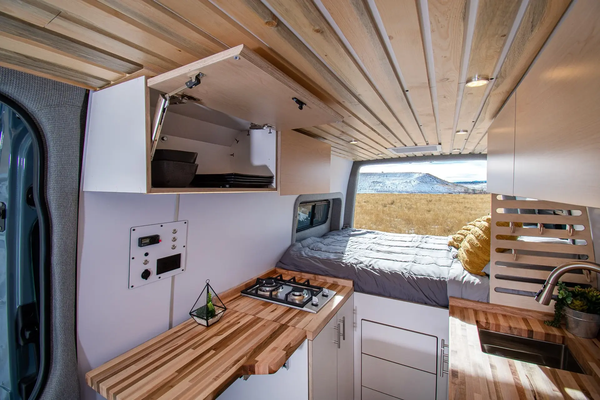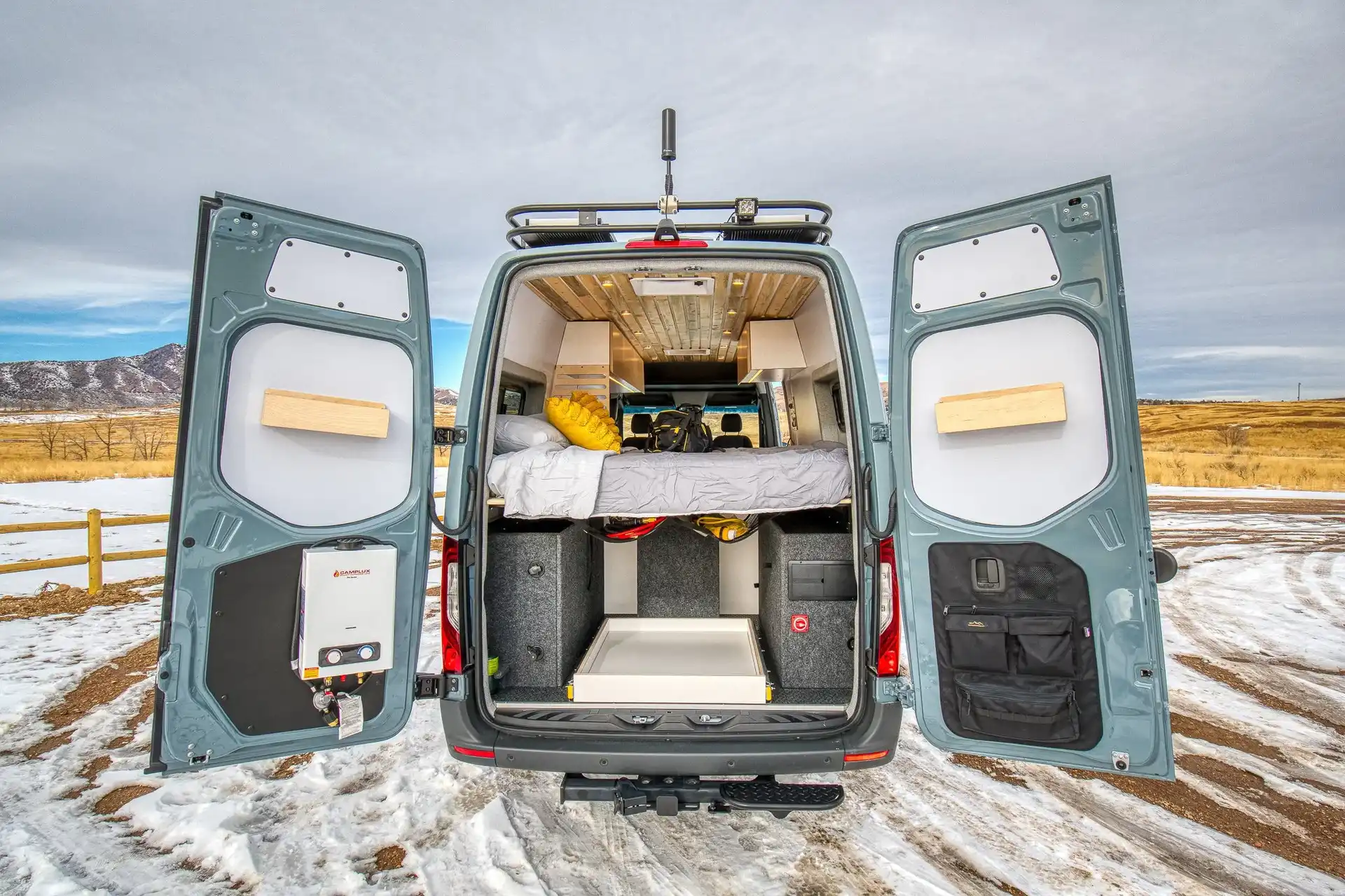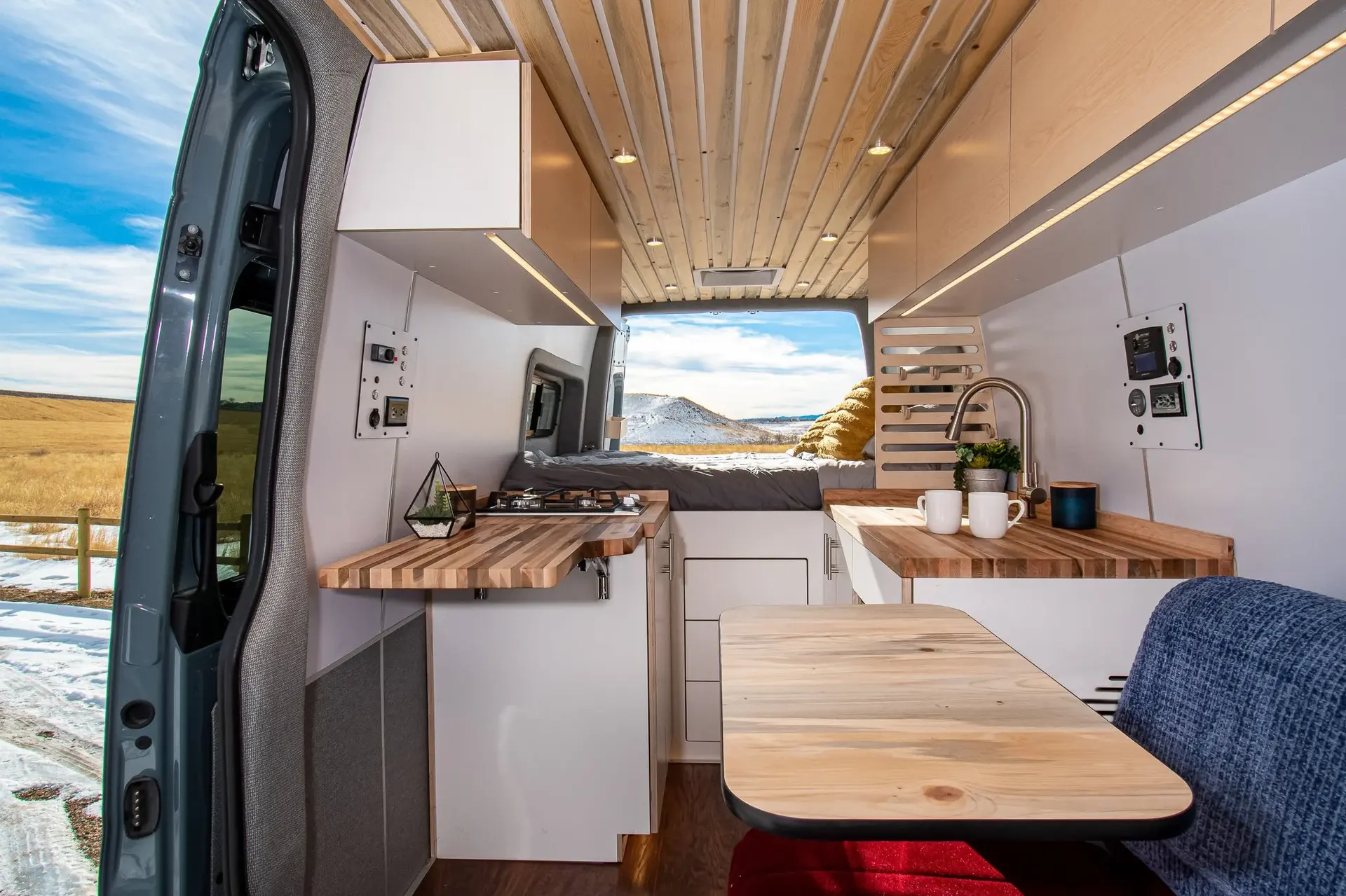 A 2021 Mercedes Sprinter 170" 4x4 packed with amenities and upgrades that are both stylish and functional. Notable features include a red sofa bed, slide-out cargo drawer, Baja Designs LP9 off-road lighting, a matte vinyl wrap, and Van Compass Stage 4 suspension. Dual kitchenettes on both driver and passenger sides provide maximum prep flexibility.