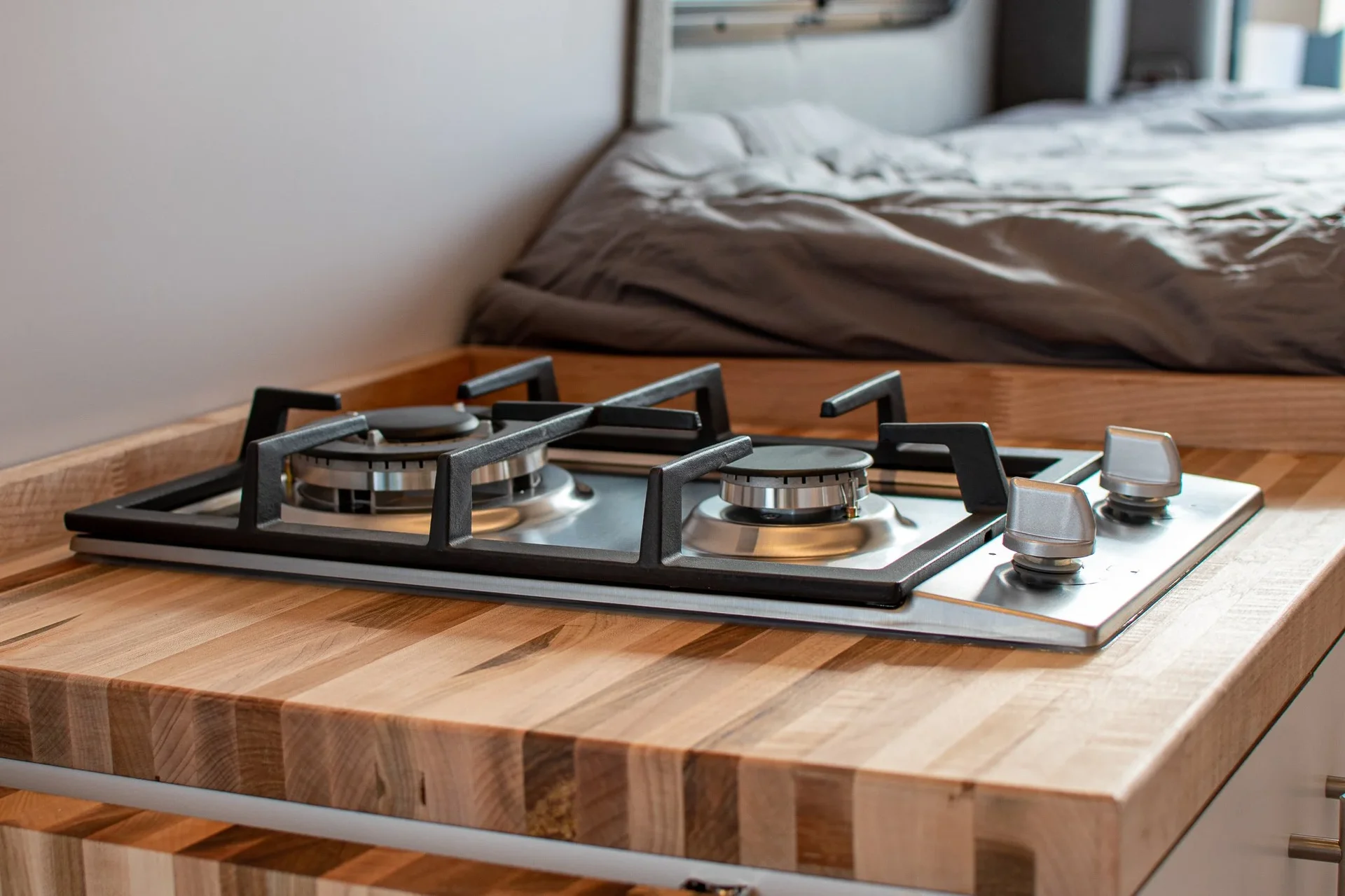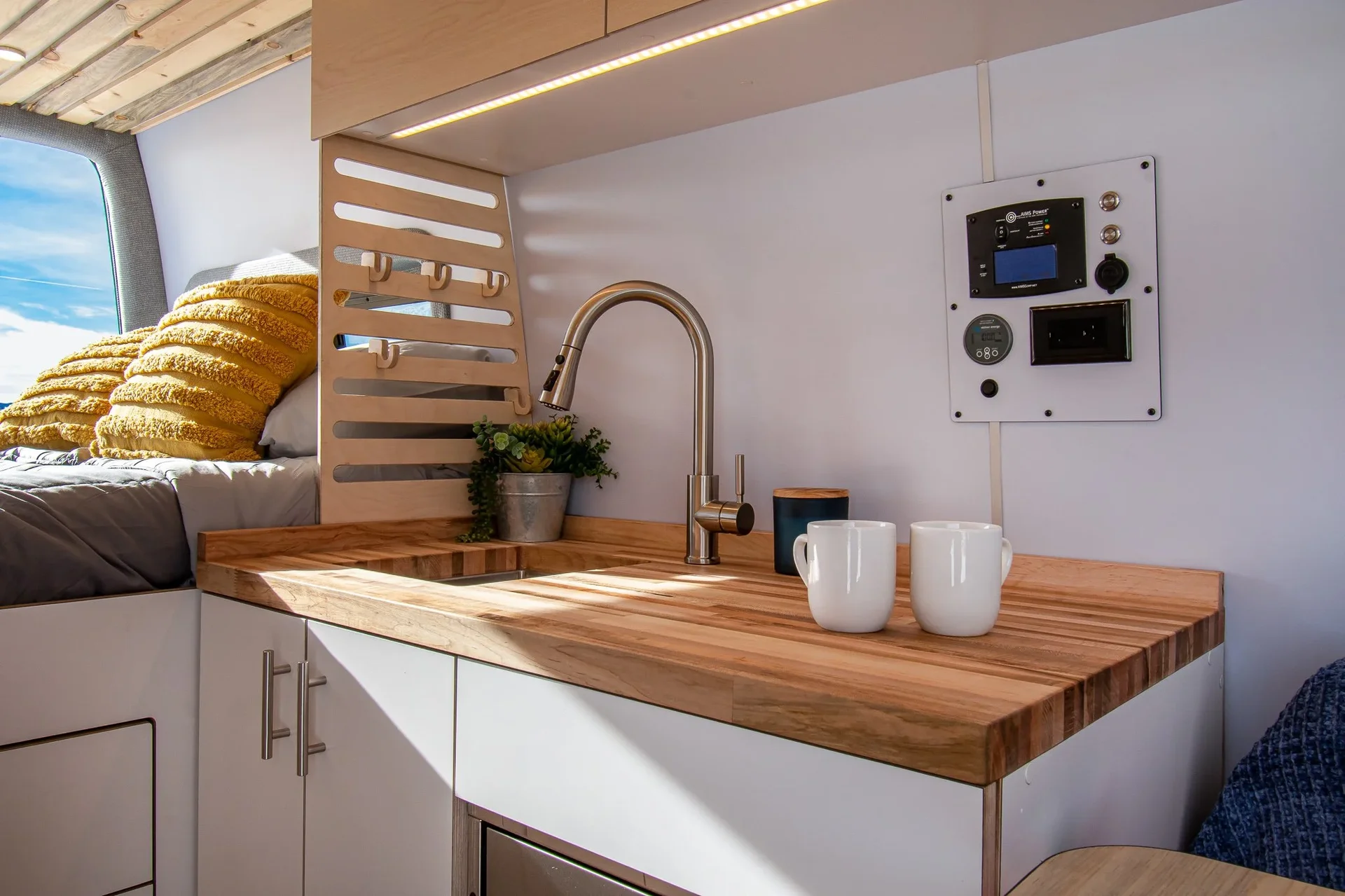 Dual kitchenettes (driver + passenger side). Dry flush toilet. Cell signal booster. LED lighting system. 3M Thinsulate insulation. Slide-out cargo drawer.