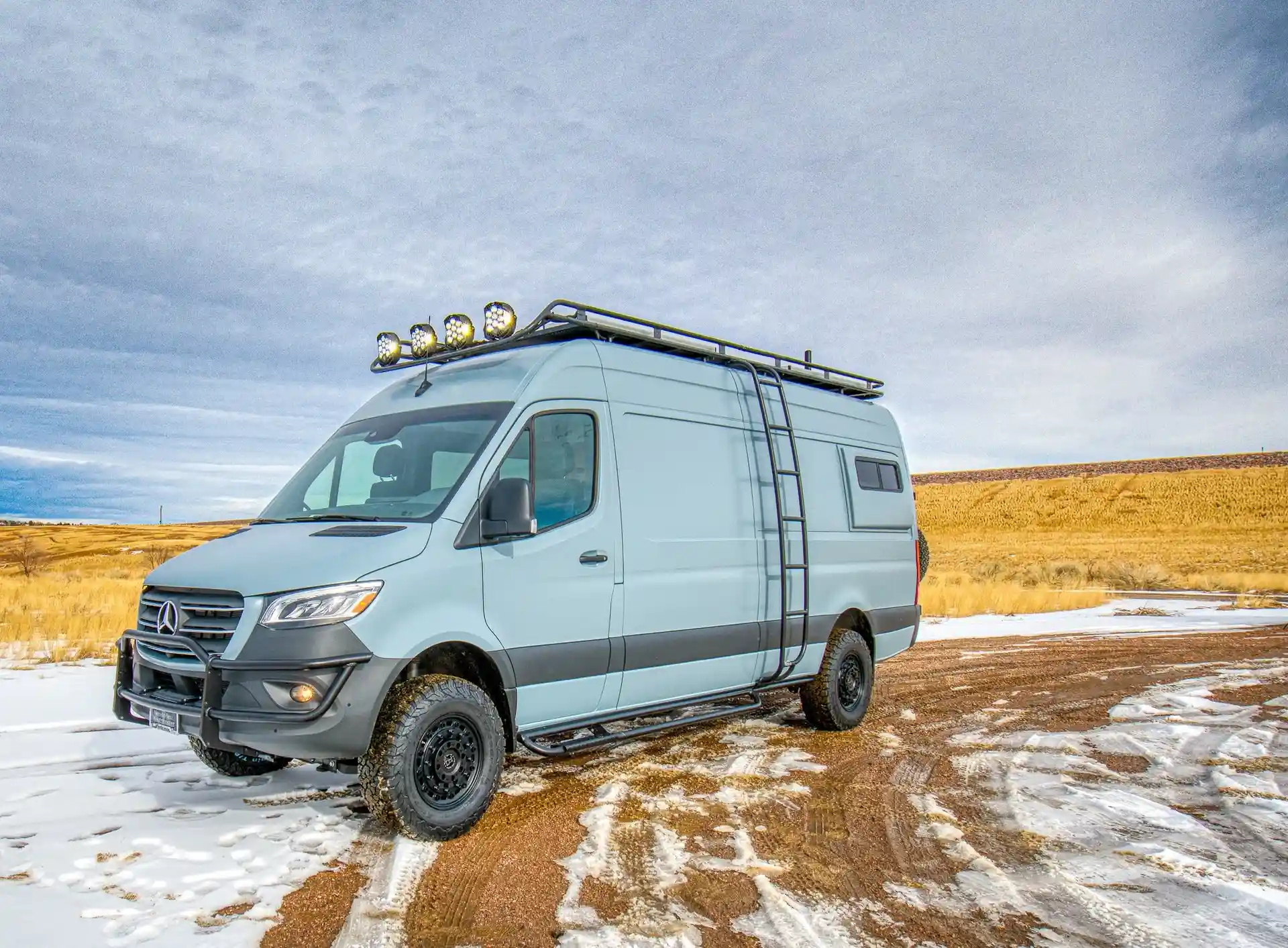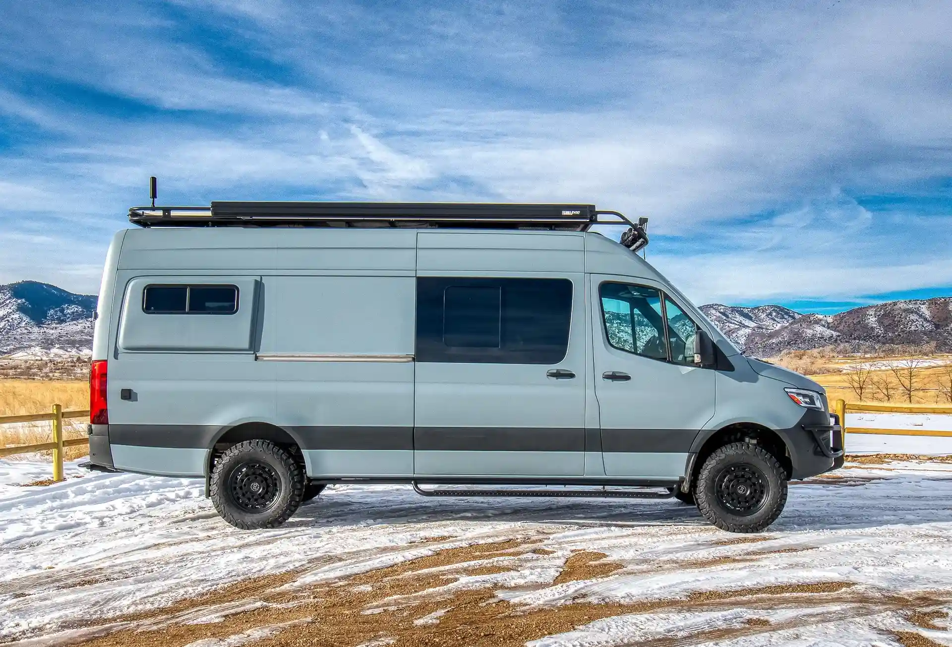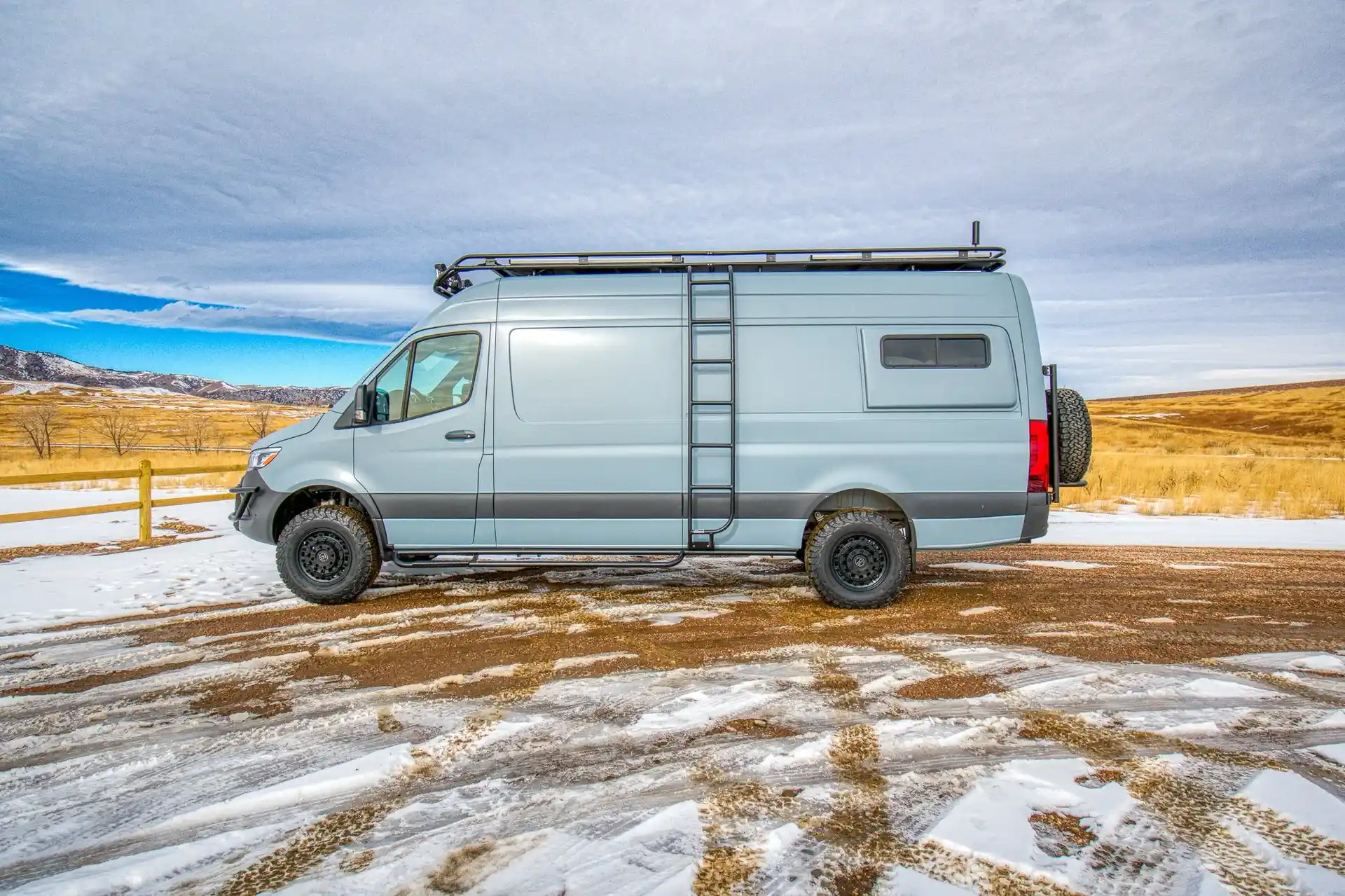 Matte vinyl wrap. Aluminess ladder, roof rack, nerf bars, and brush guard. Baja Designs LP9 off-road lights. Owl Vans spare tire carrier. Van Compass Stage 4 suspension. Fiamma 11' awning. Agile Mini fenders. Black Rhino wheels with all-terrain tires. Flarespace body flares.