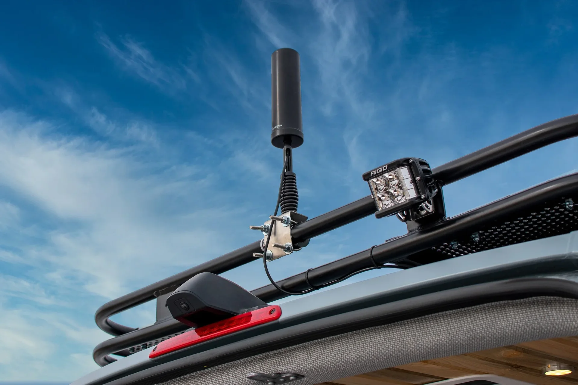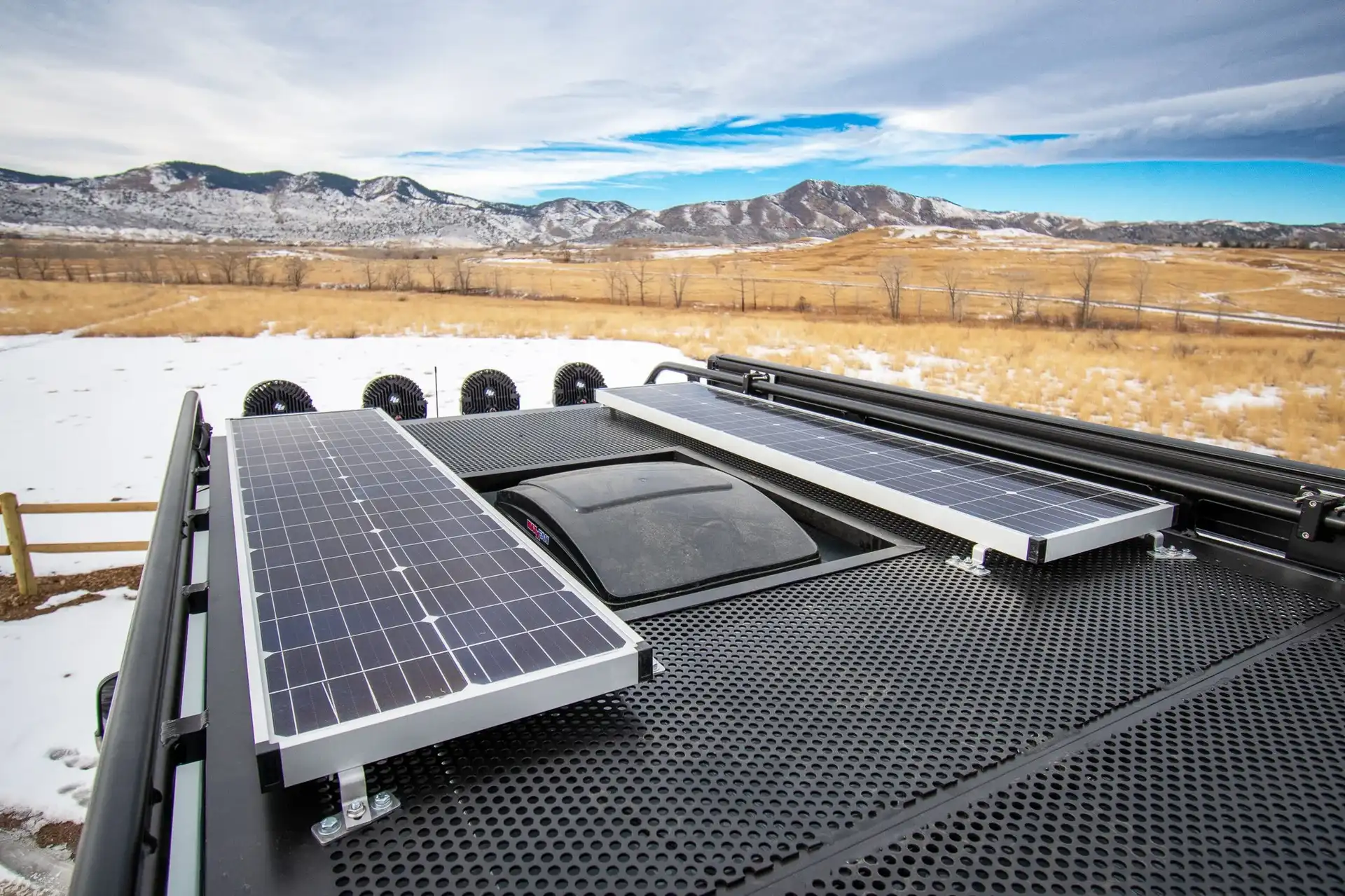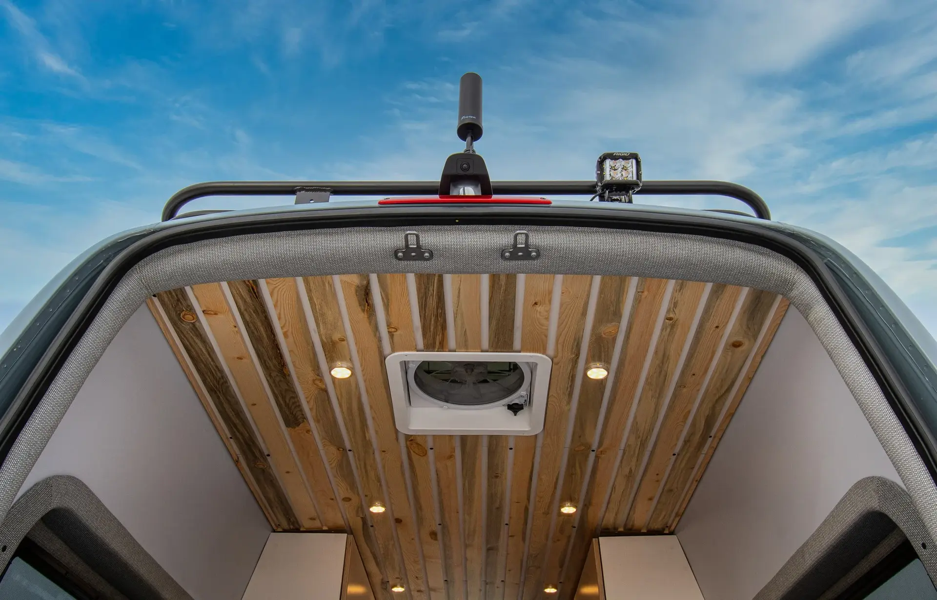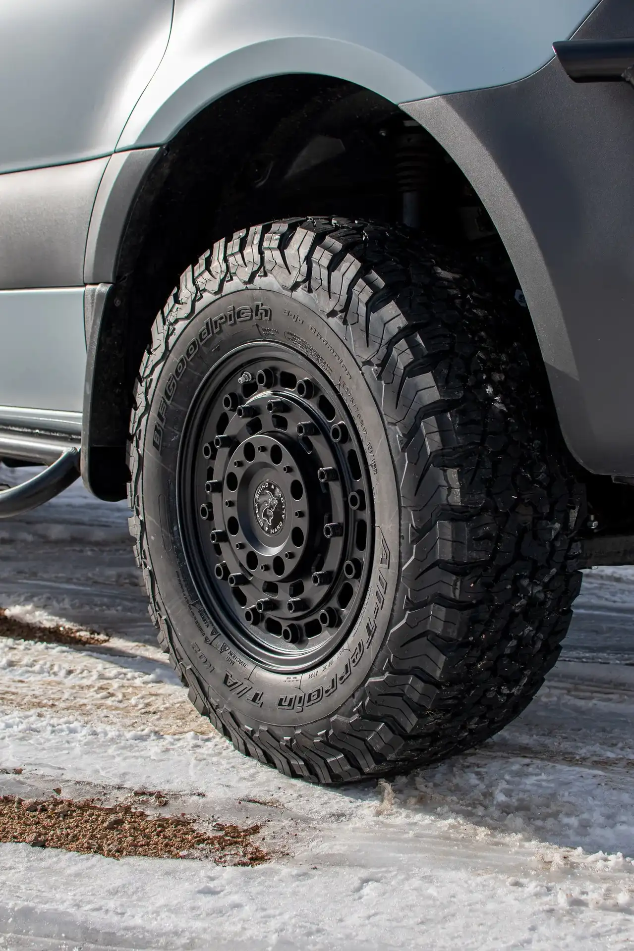Matte vinyl wrap. Aluminess ladder, roof rack, nerf bars, and brush guard. Baja Designs LP9 off-road lights. Owl Vans spare tire carrier. Van Compass Stage 4 suspension. Fiamma 11' awning. Agile Mini fenders. Black Rhino wheels with all-terrain tires. Flarespace body flares.