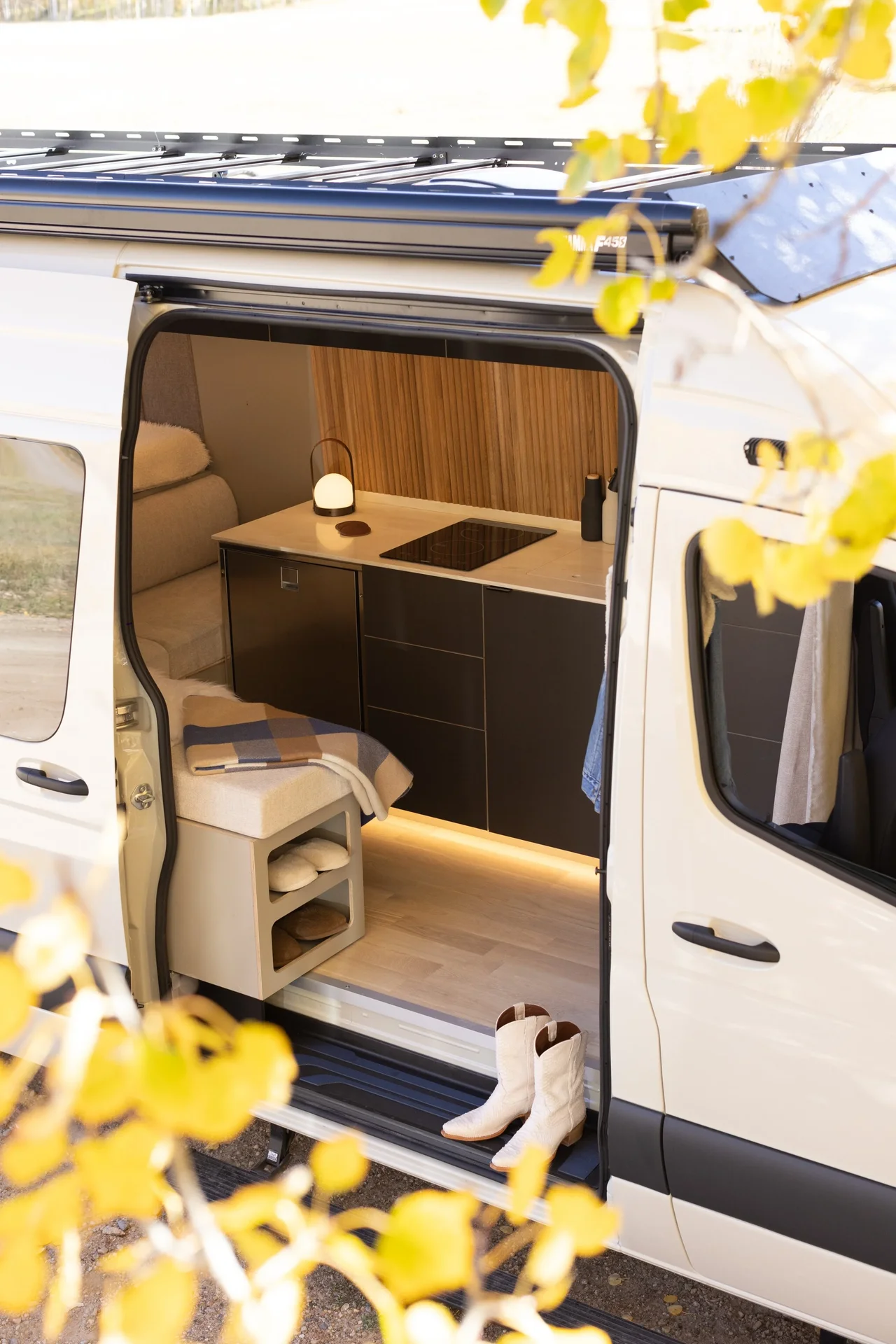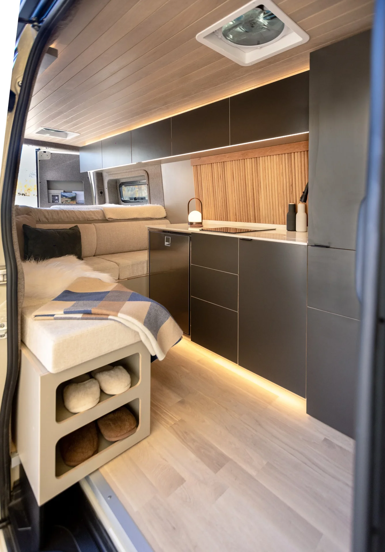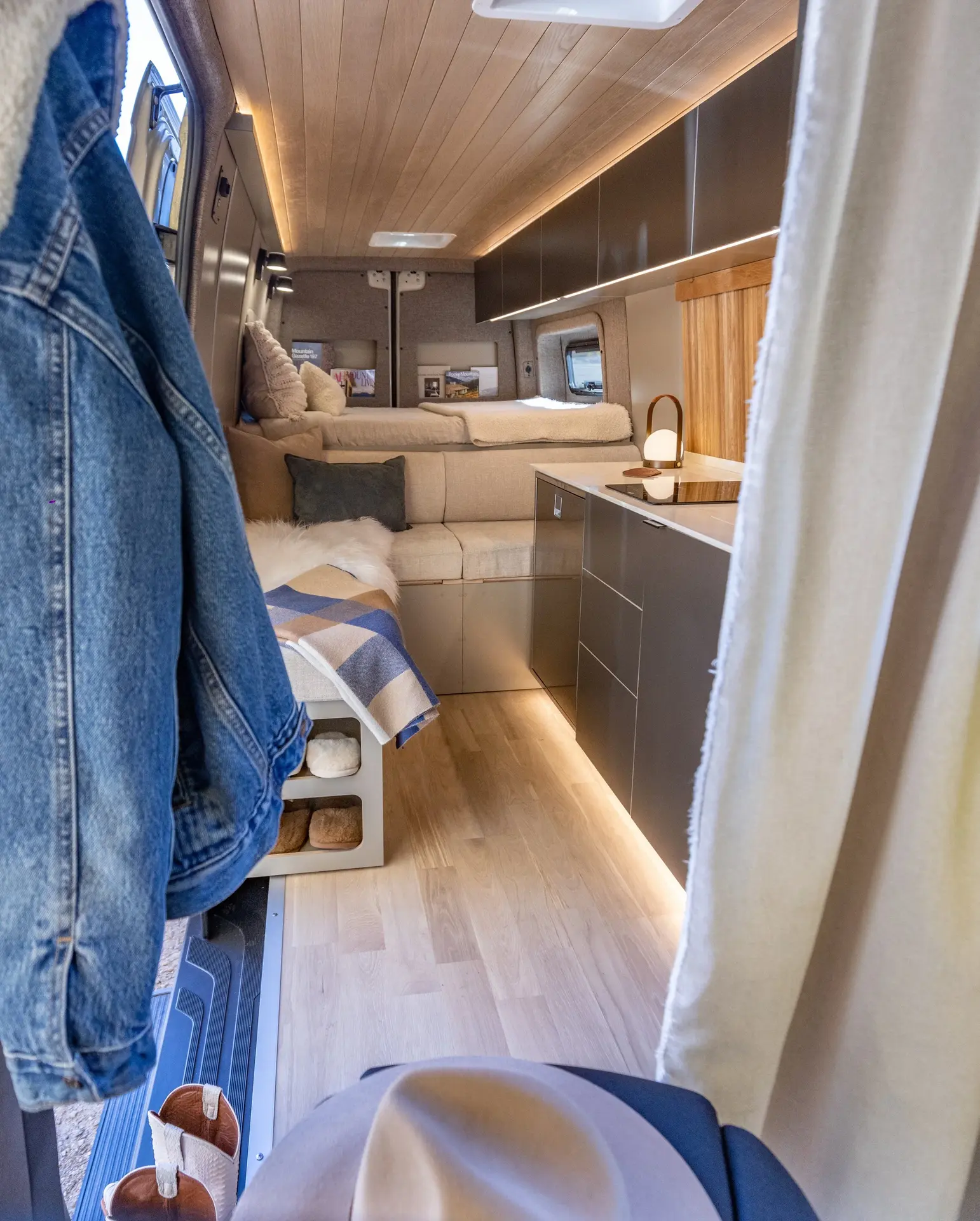 A collaborative luxury conversion created with Hygge Life on a 2022 Mercedes Sprinter 170" 4x2 platform. The design philosophy centers on invoking a sense of coziness, contentment, and well-being with white oak tongue-and-groove ceiling, flooring, and tambour backsplash throughout. Features Flarespace flares for extra interior width and a full-length upper driver-side cabinet system.