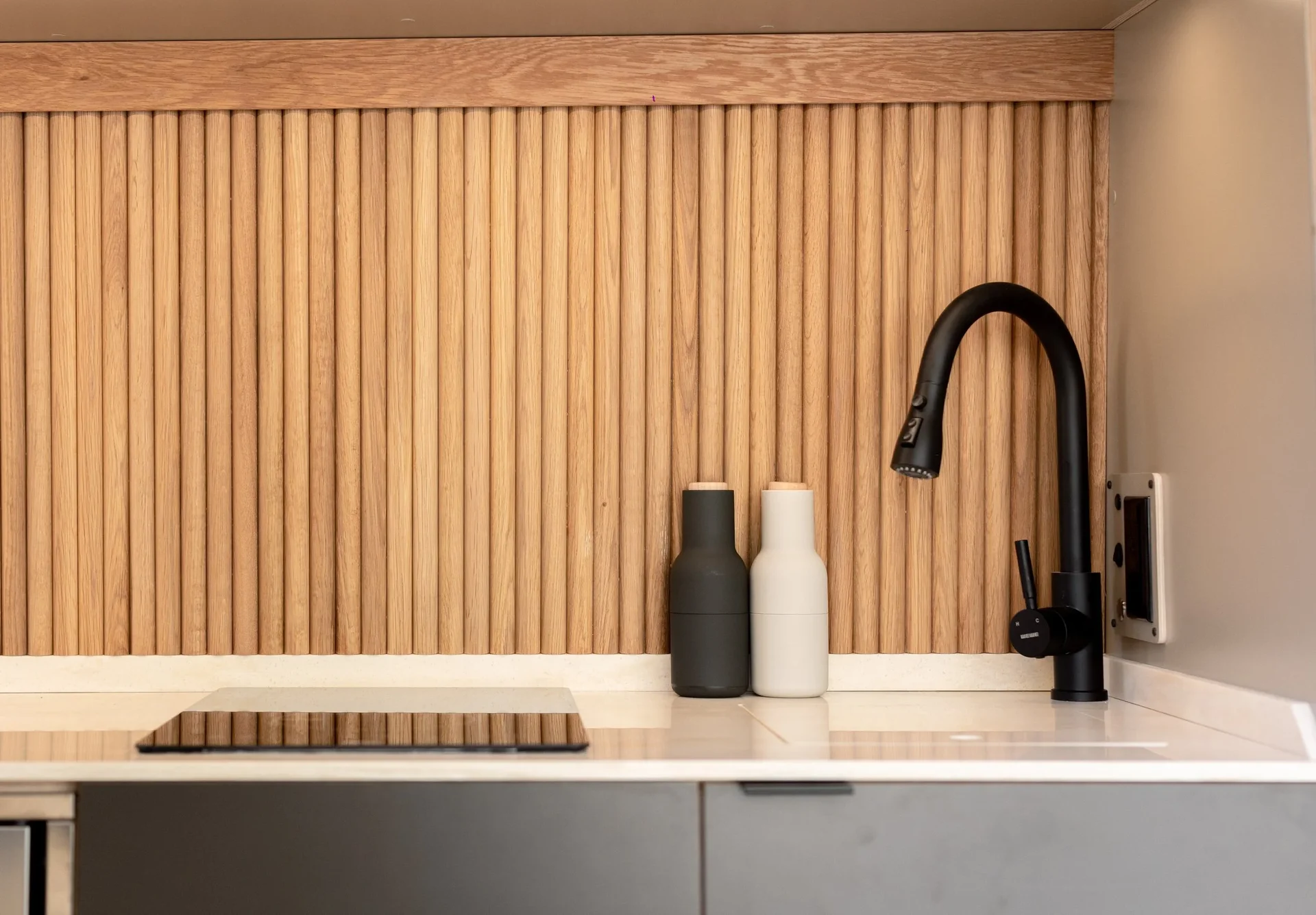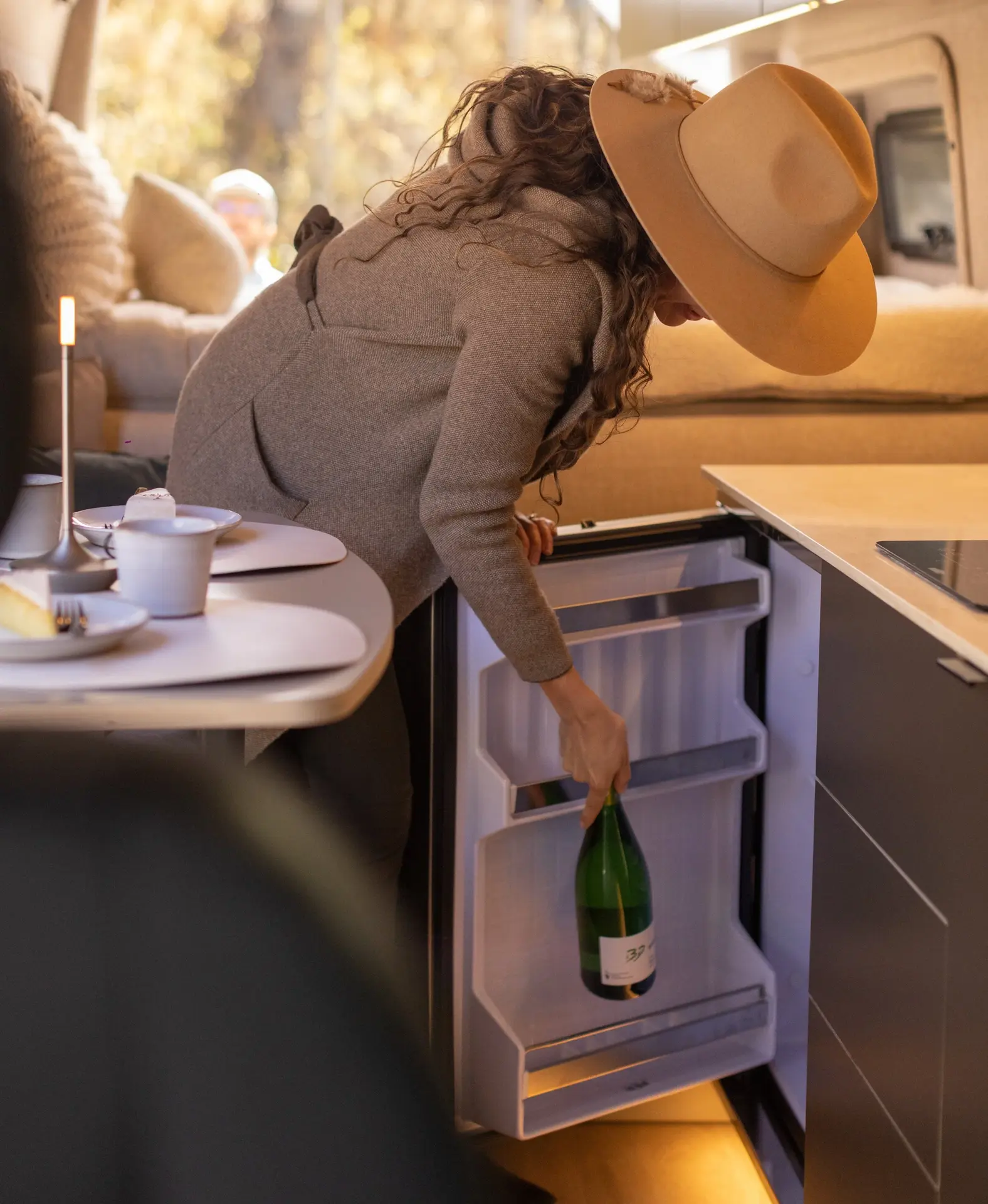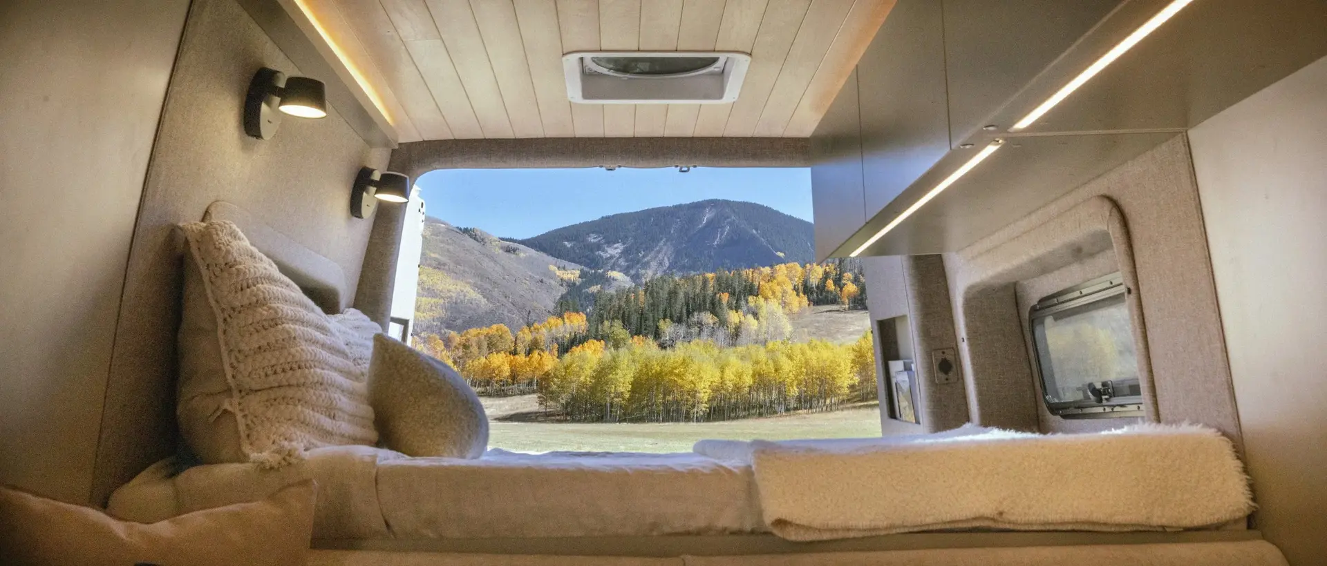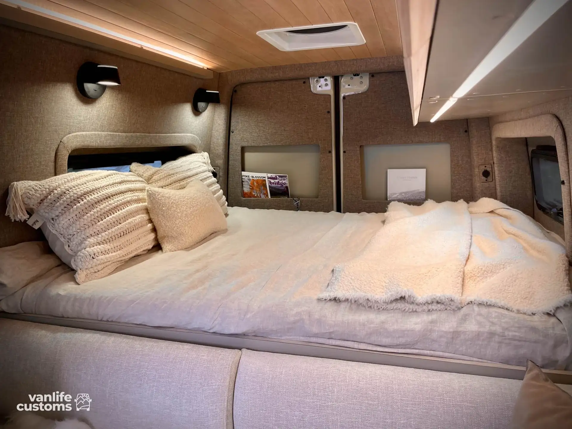 A collaborative luxury conversion created with Hygge Life on a 2022 Mercedes Sprinter 170" 4x2 platform. The design philosophy centers on invoking a sense of coziness, contentment, and well-being with white oak tongue-and-groove ceiling, flooring, and tambour backsplash throughout. Features Flarespace flares for extra interior width and a full-length upper driver-side cabinet system.
