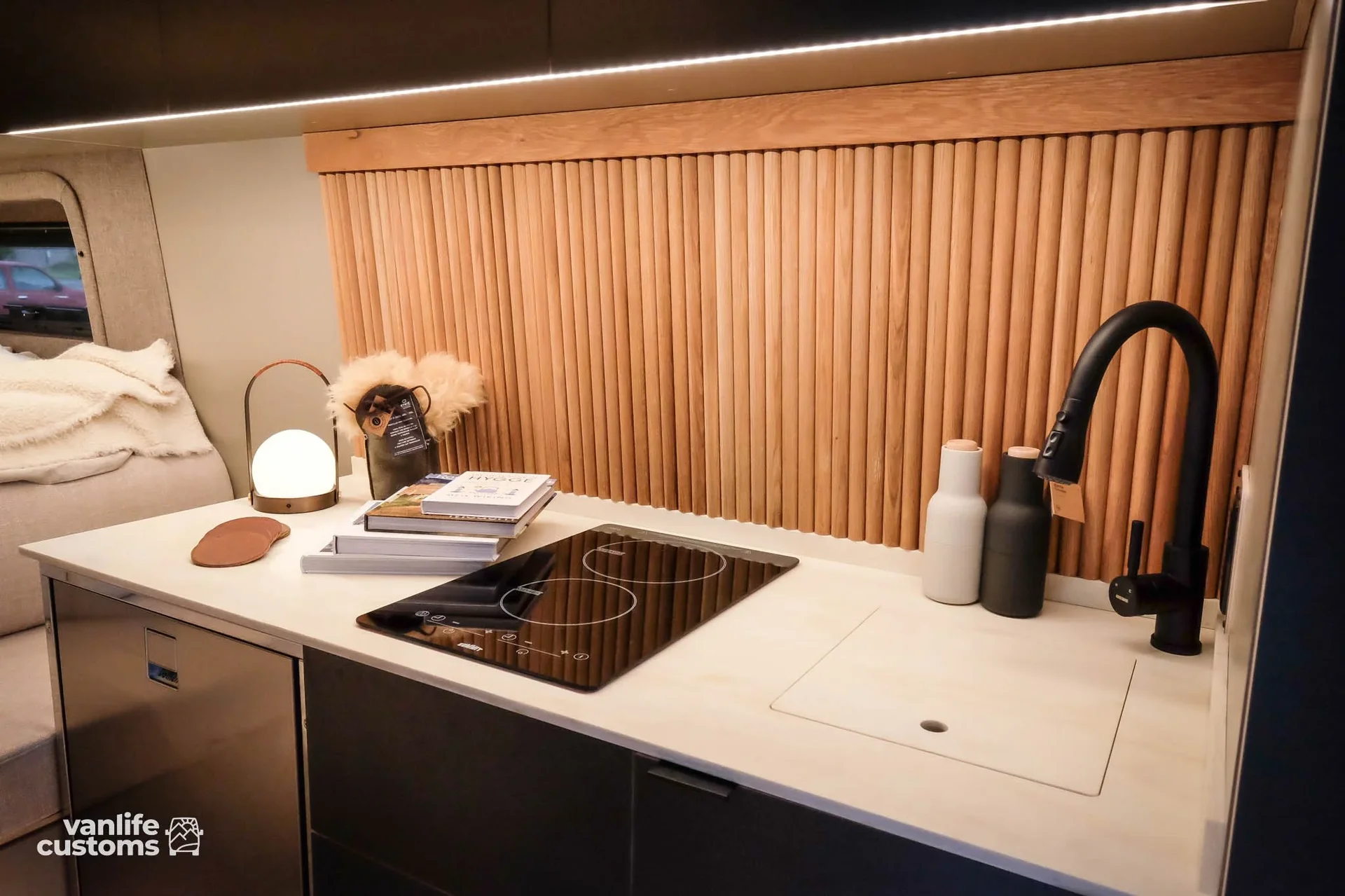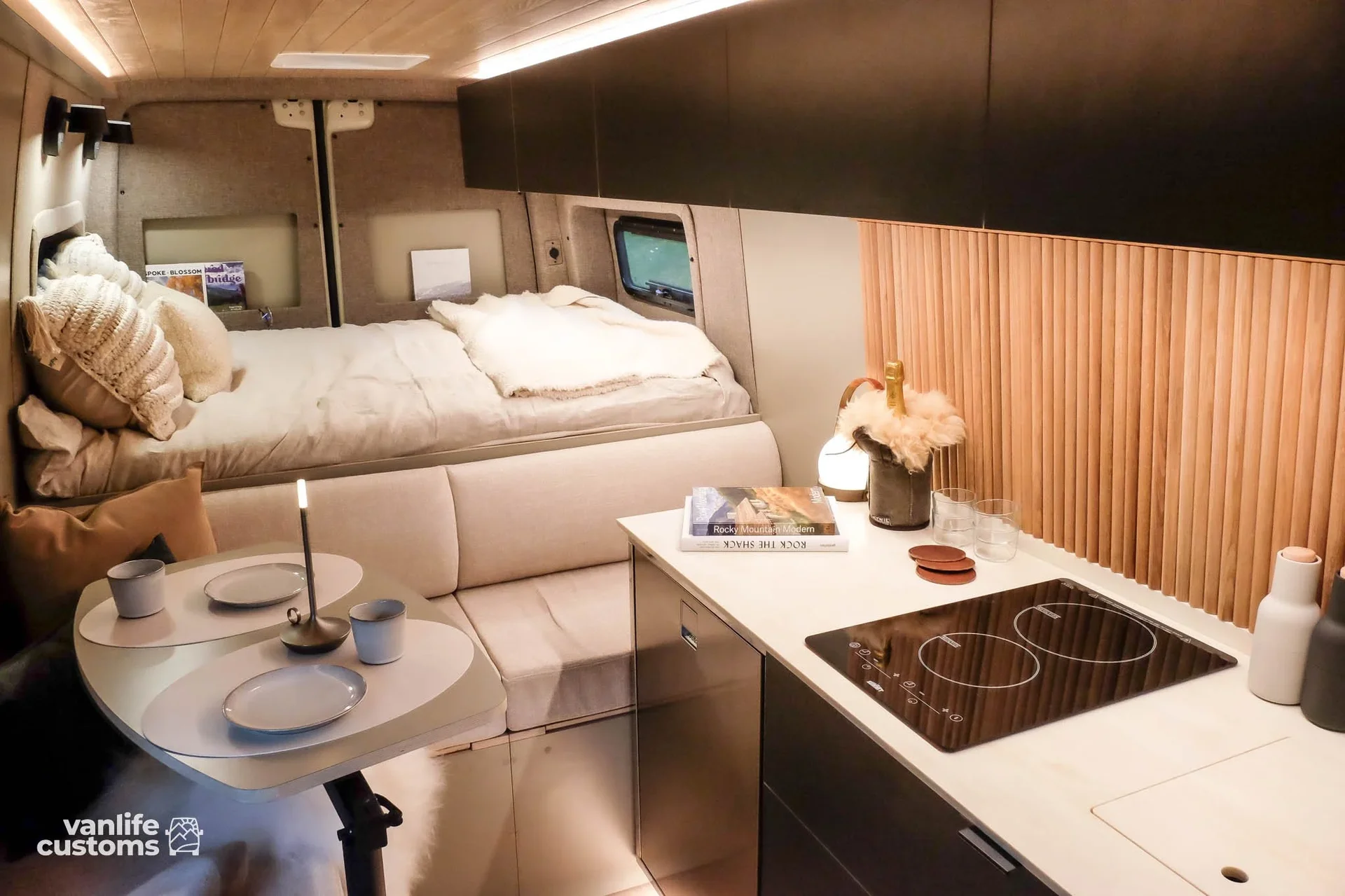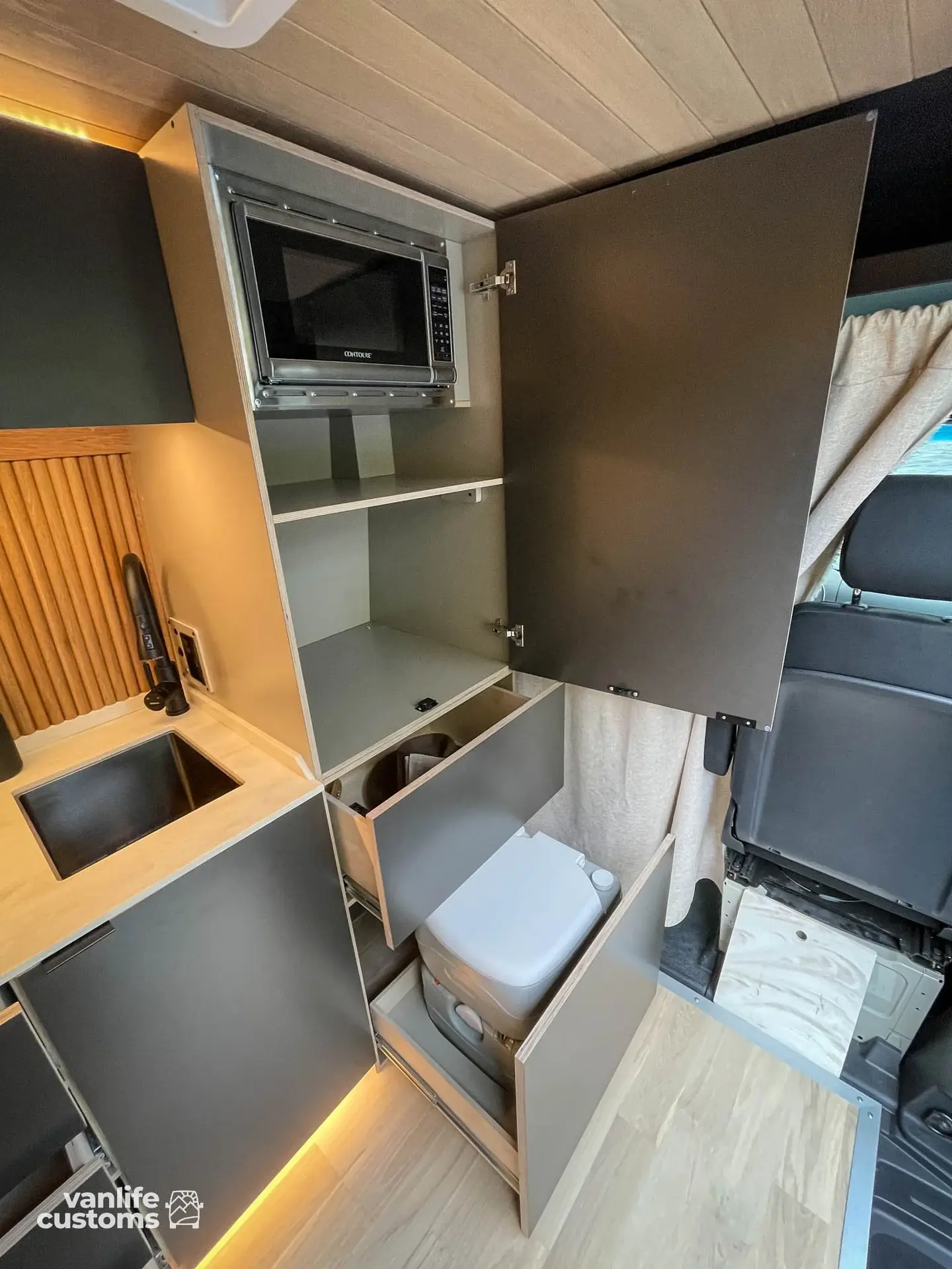 White oak T&G ceiling, flooring, and tambour backsplash. Hanex countertop. 12V stainless steel microwave. Full-length upper driver-side cabinets. Extra-large sectional storage bench with cubbies. 3M Thinsulate insulation with sound dampening.
