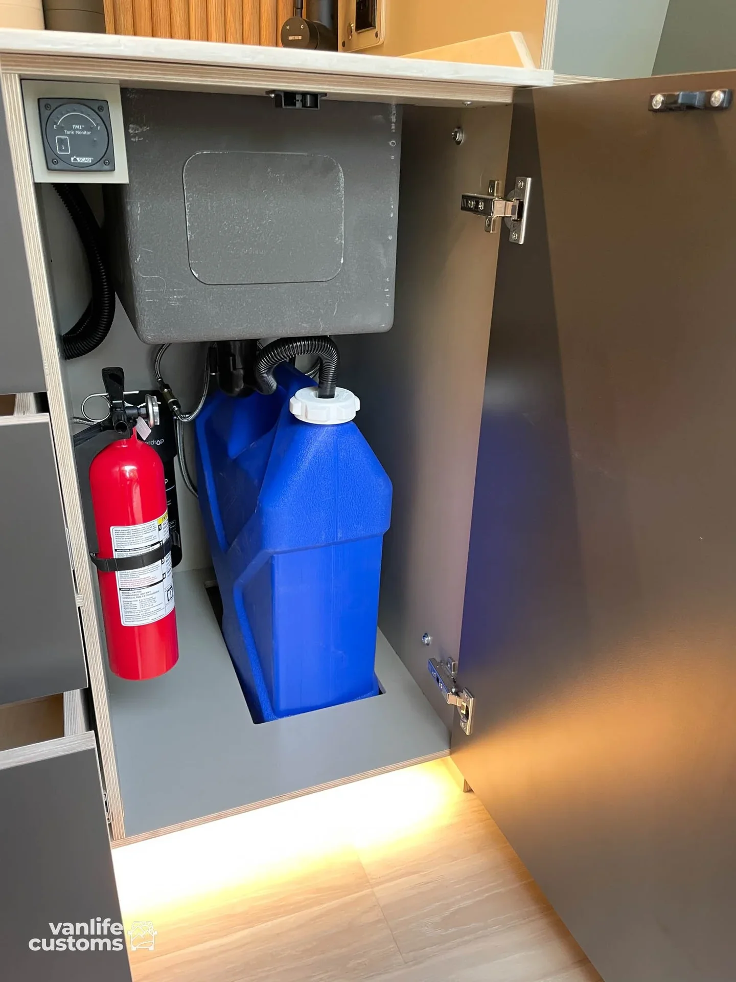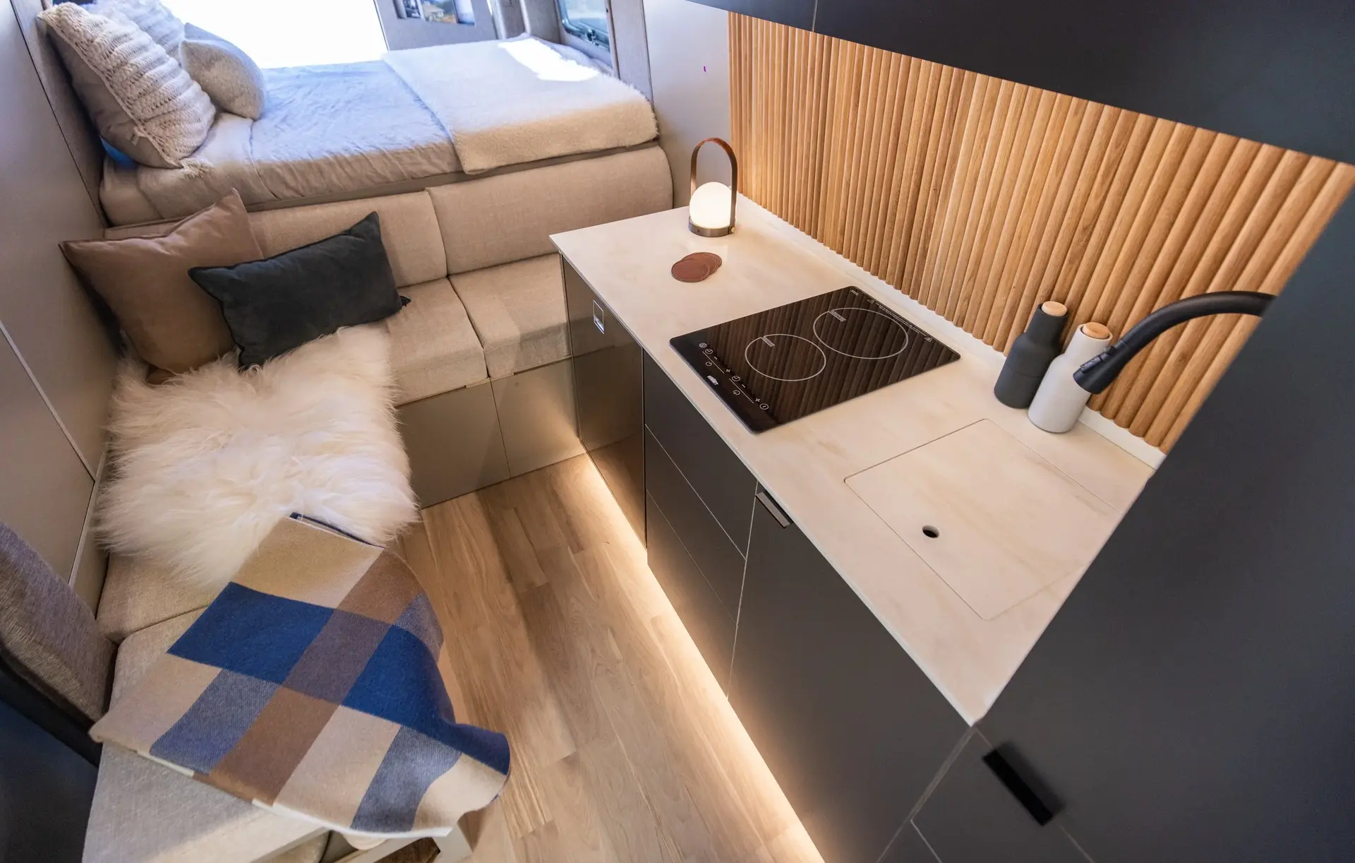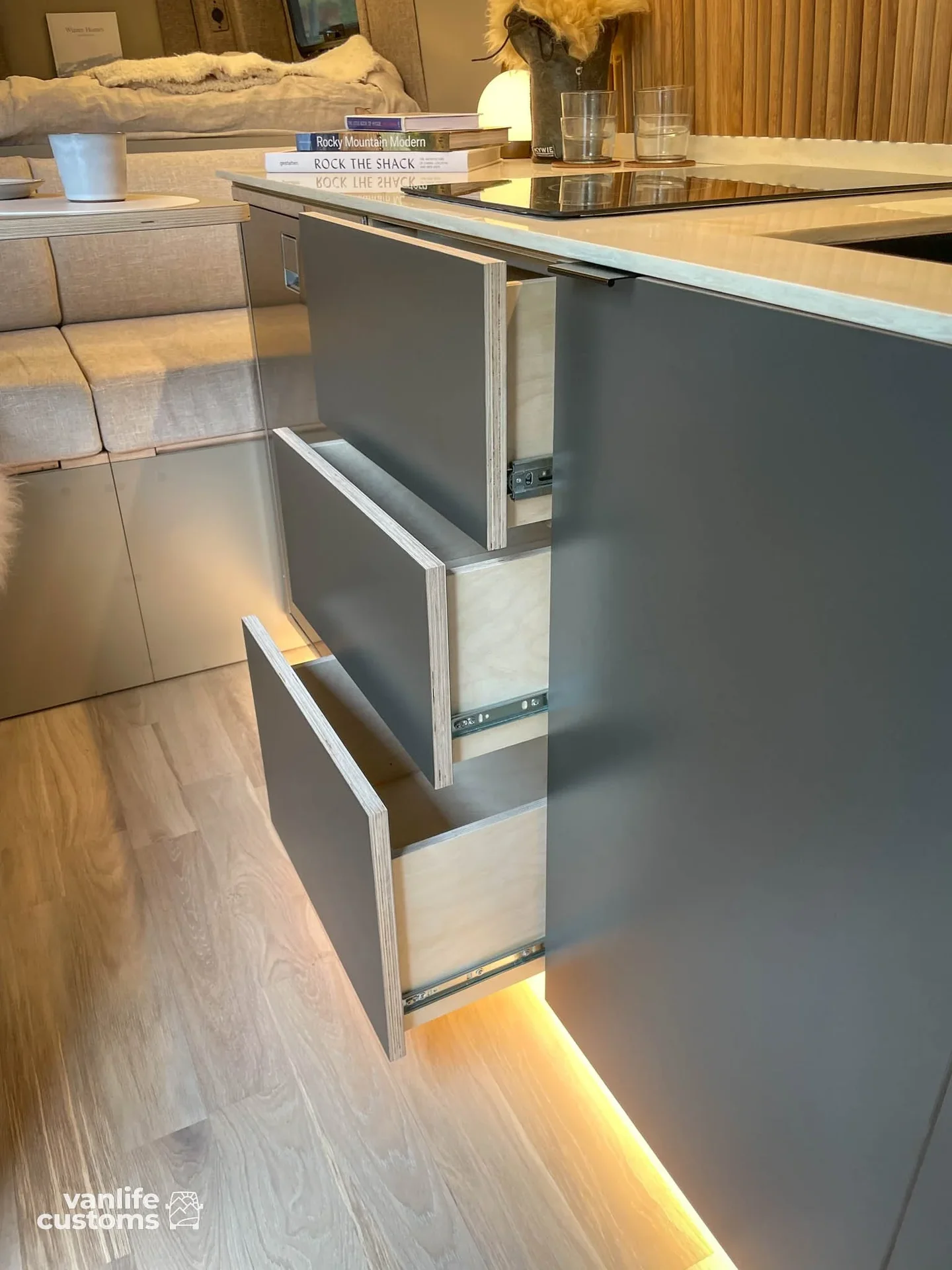 White oak T&G ceiling, flooring, and tambour backsplash. Hanex countertop. 12V stainless steel microwave. Full-length upper driver-side cabinets. Extra-large sectional storage bench with cubbies. 3M Thinsulate insulation with sound dampening.