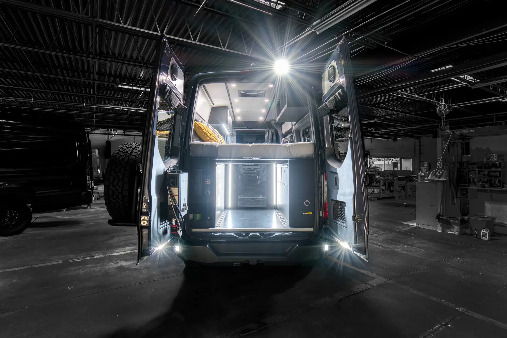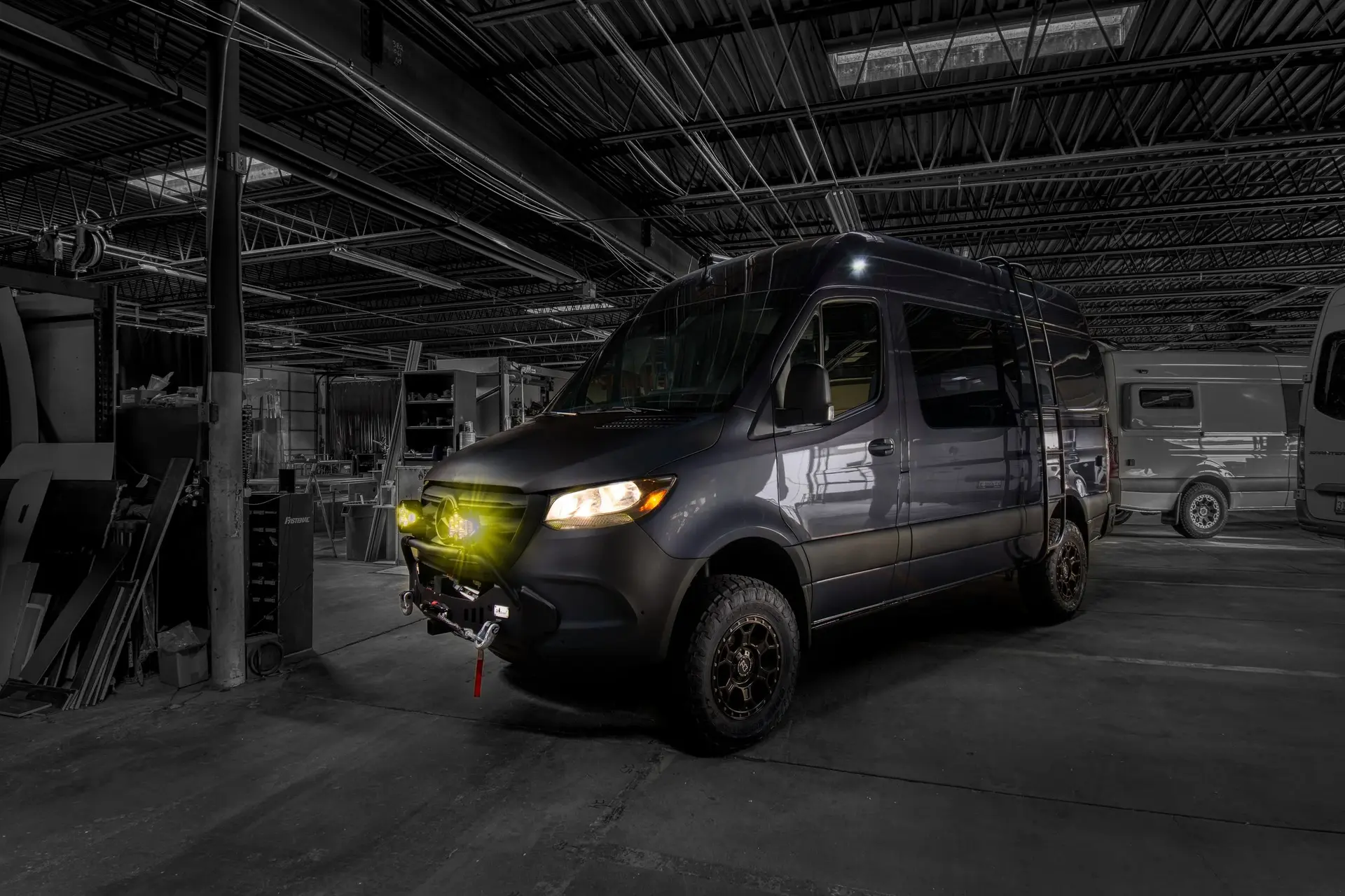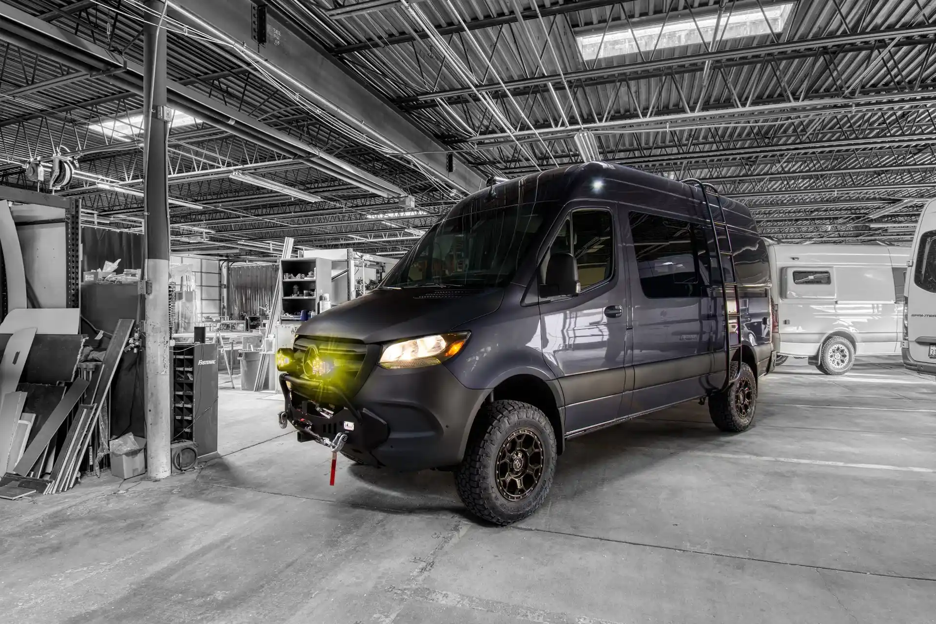 CATUMED bumper. Warn winch. Baja Designs lighting. Backwoods rear bumper. Owl Vans tire carrier. Aluminess ladder. Van Compass suspension. Black Rhino wheels with Toyo tires. ARB air kit. Matte black hood wrap. Fiamma awning. Rigid LED lights. AMP Research power steps.
