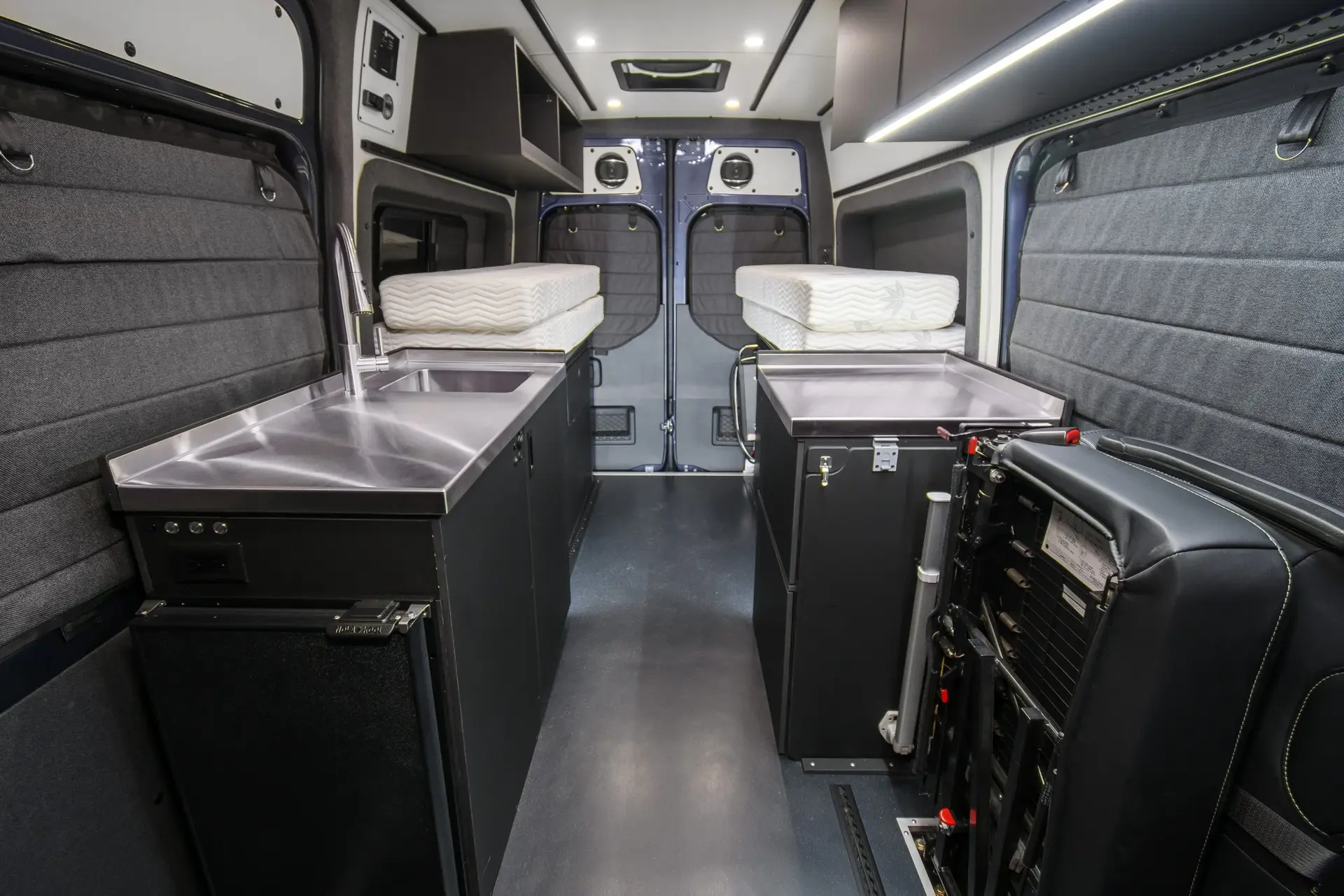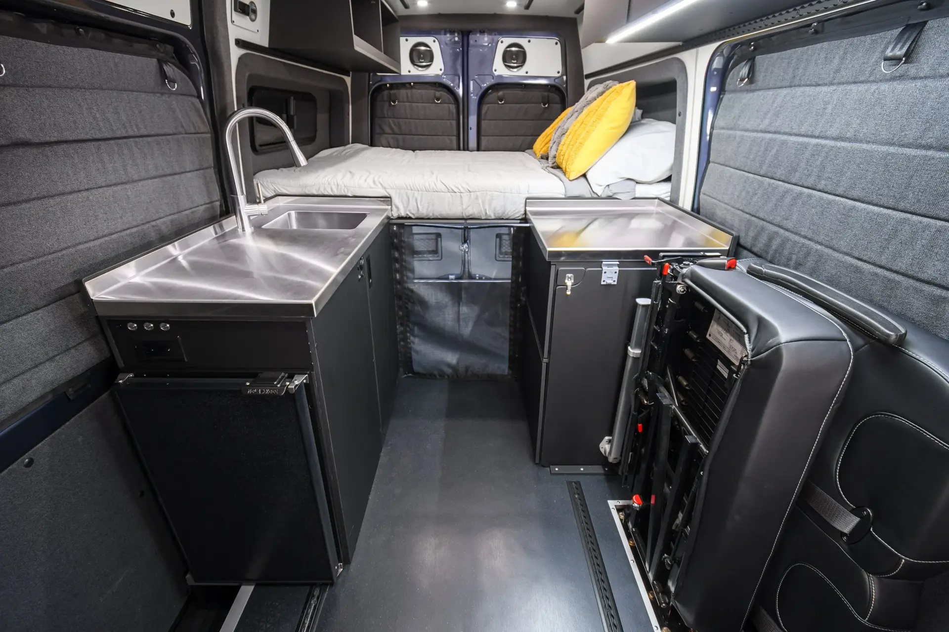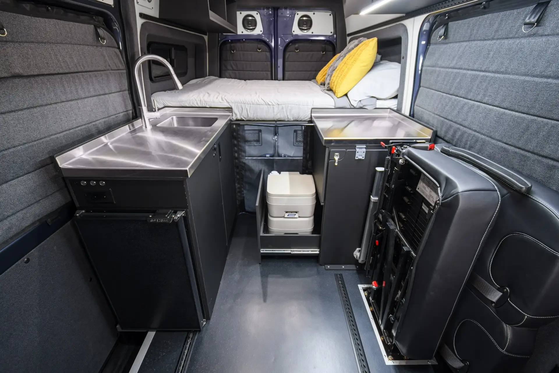 Matte black Infiniti ColorCore Formica cabinetry. Stainless steel countertop and sink. Hidden cassette toilet. Fold-away platform bed. 3M Thinsulate insulation with sound dampening.