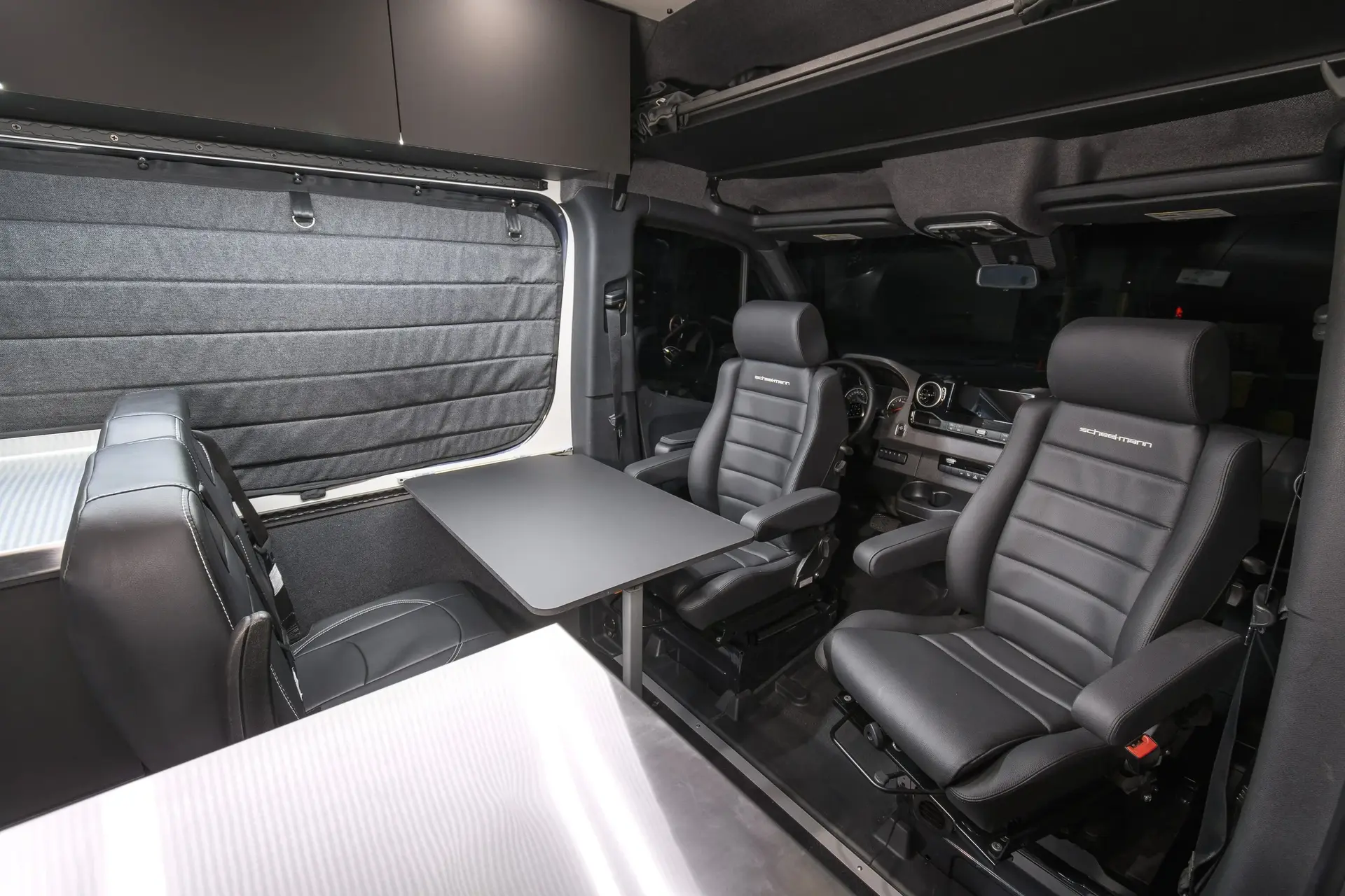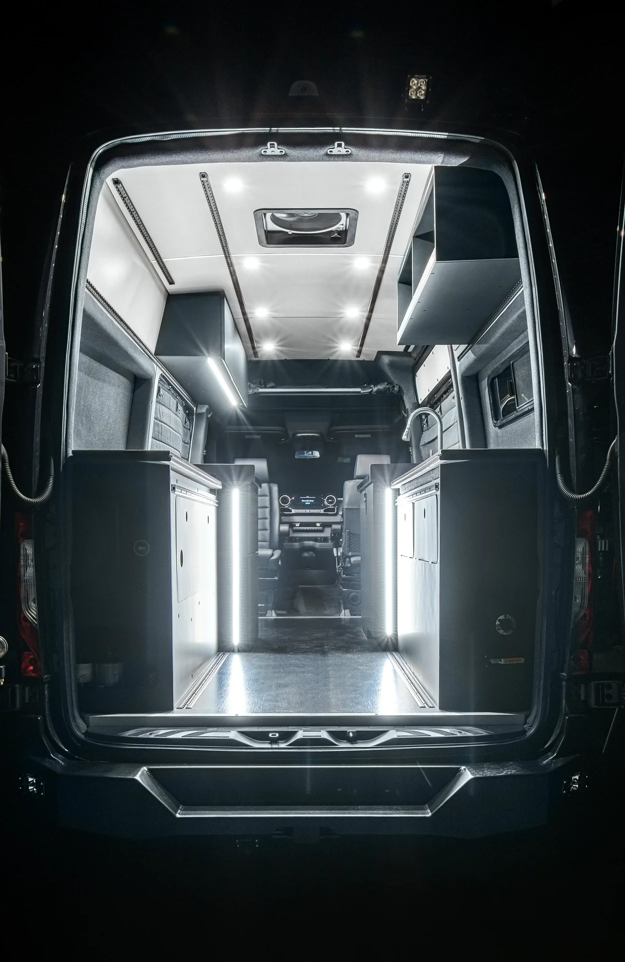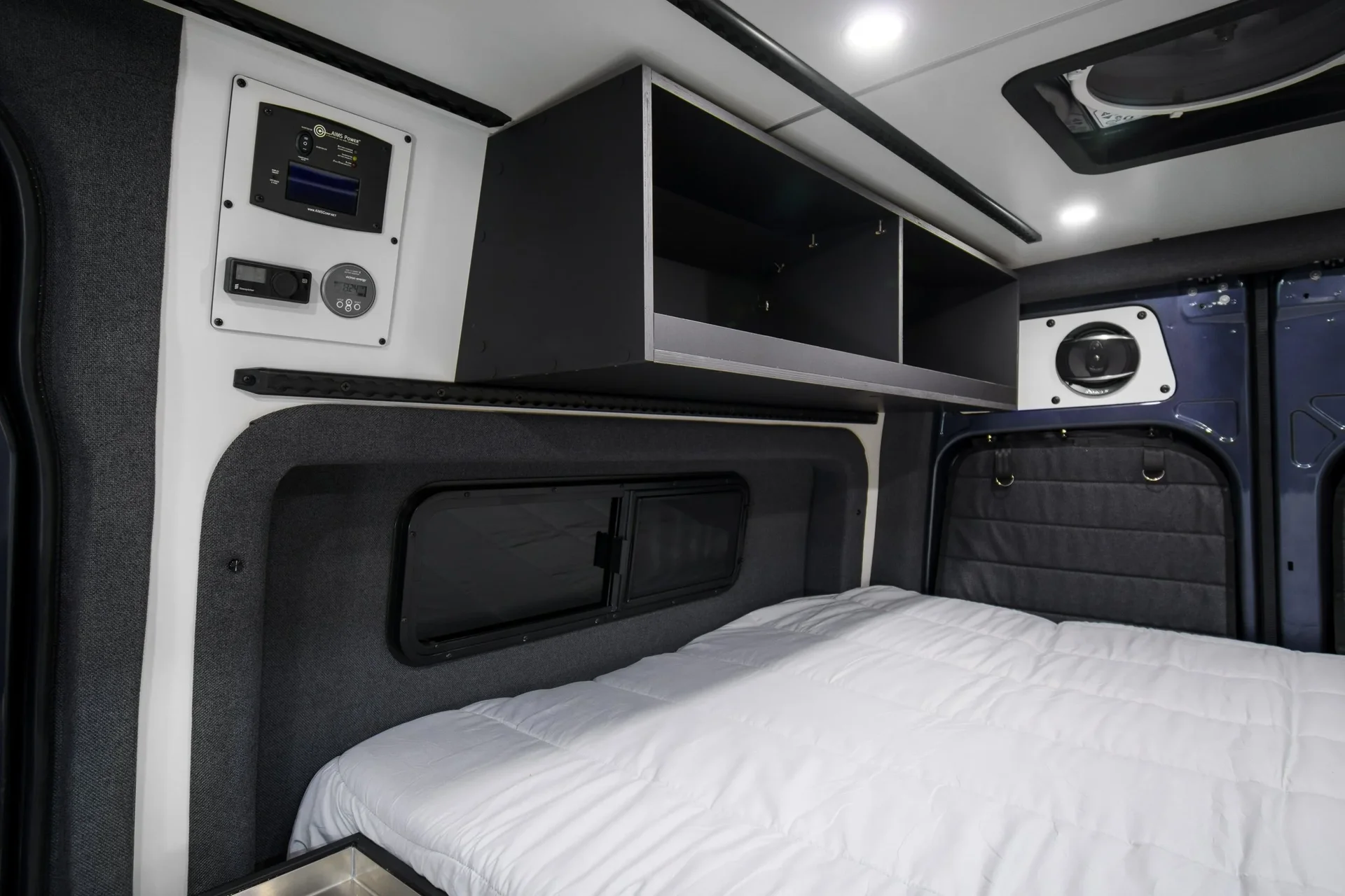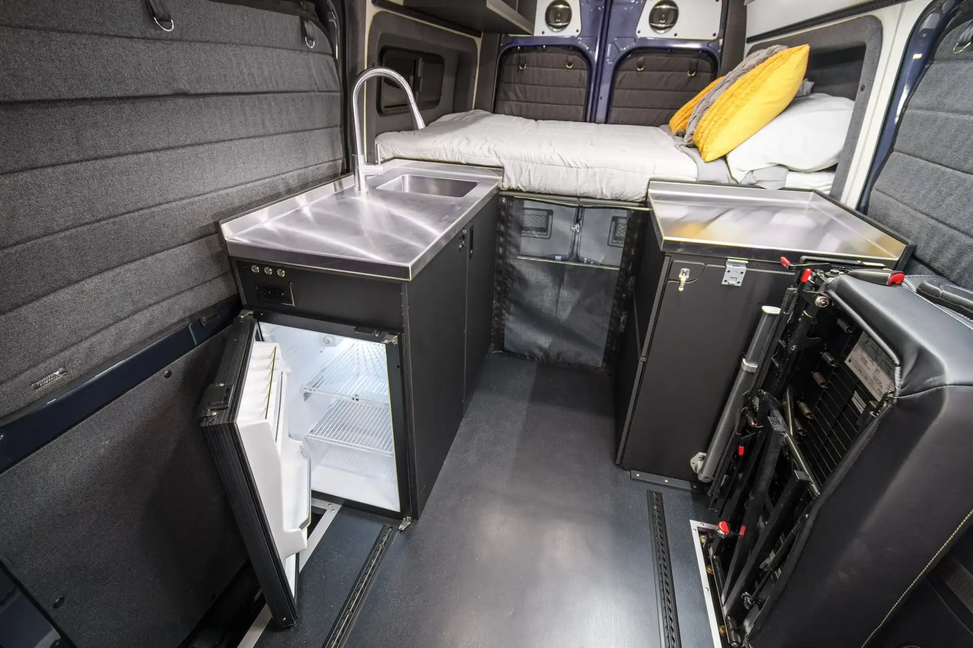 Matte black Infiniti ColorCore Formica cabinetry. Stainless steel countertop and sink. Hidden cassette toilet. Fold-away platform bed. 3M Thinsulate insulation with sound dampening.