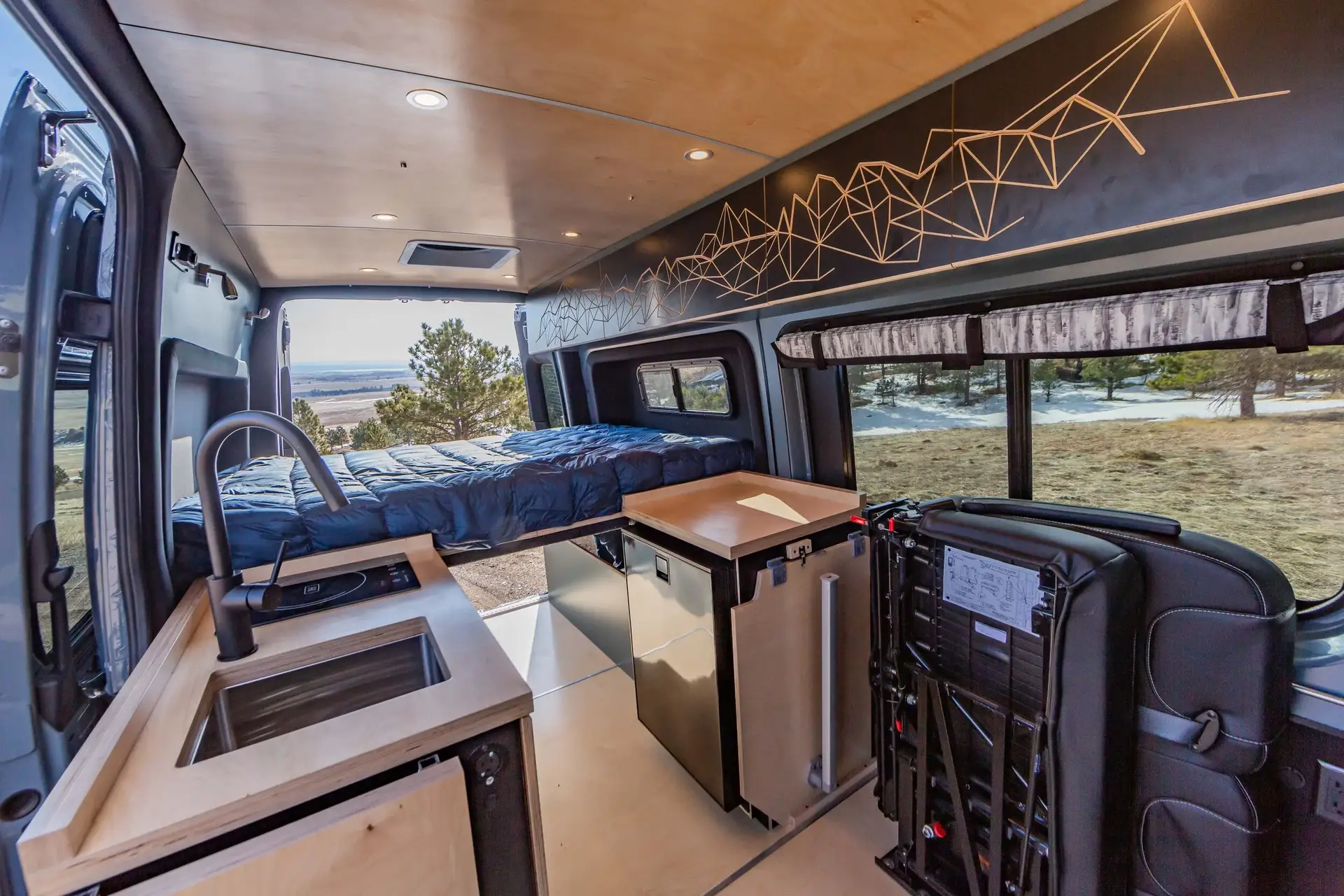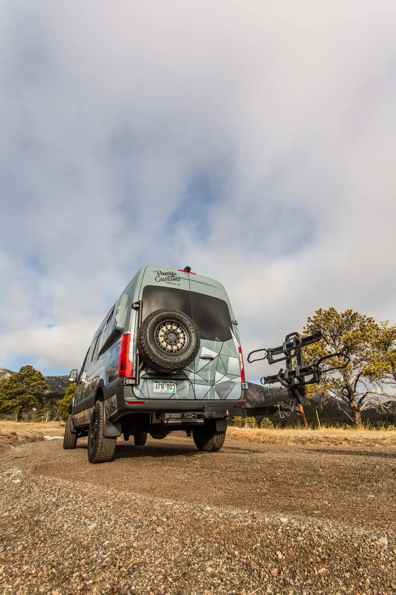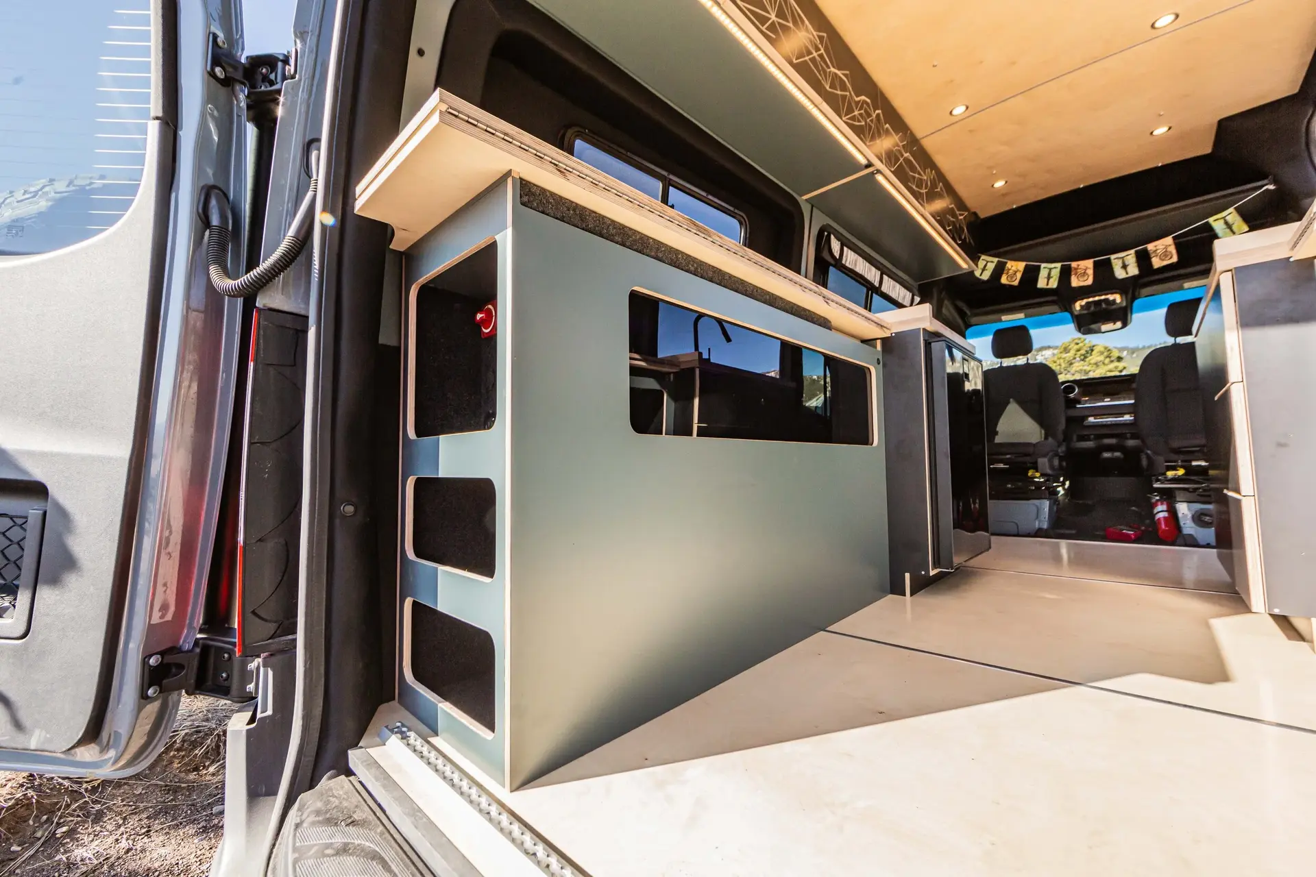 A fully equipped 2019 Freightliner Sprinter 144" 4x4 High Roof incorporating Vanlife Customs' best systems — upgraded Fox suspension, robust electrical infrastructure, and premium comfort amenities. Features a 2-person flip-up seat with 3-point belt and child latch system, making it family-ready. Only approximately 3,000 miles at time of build.