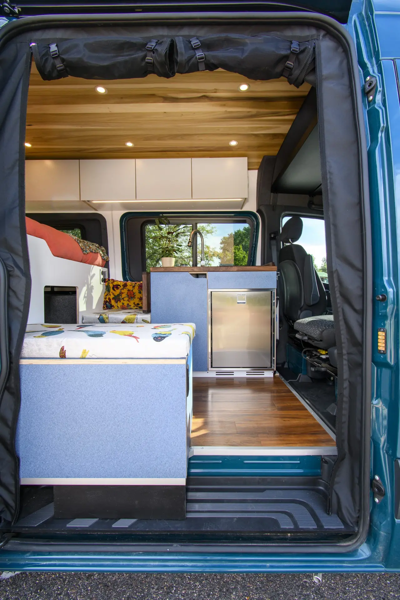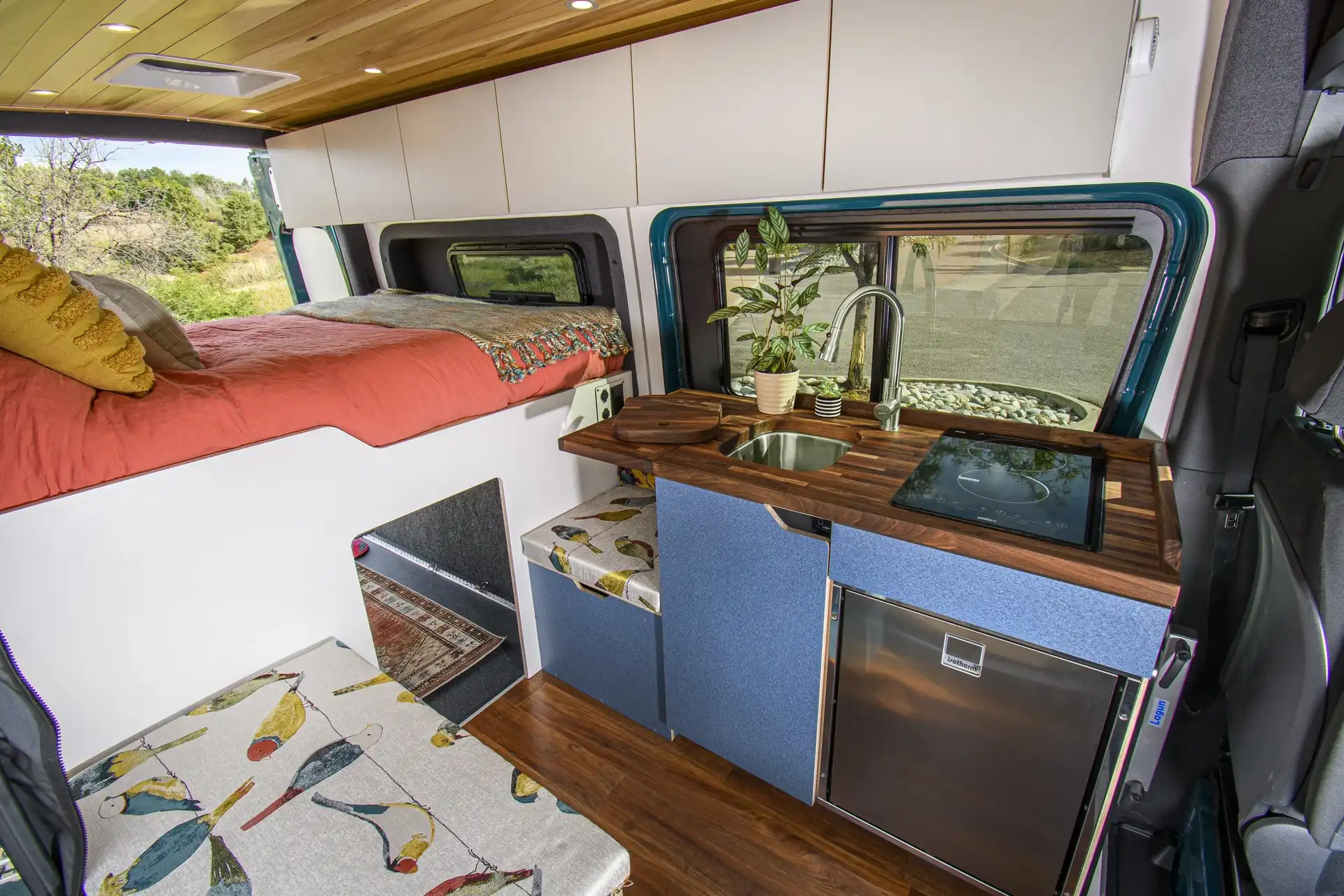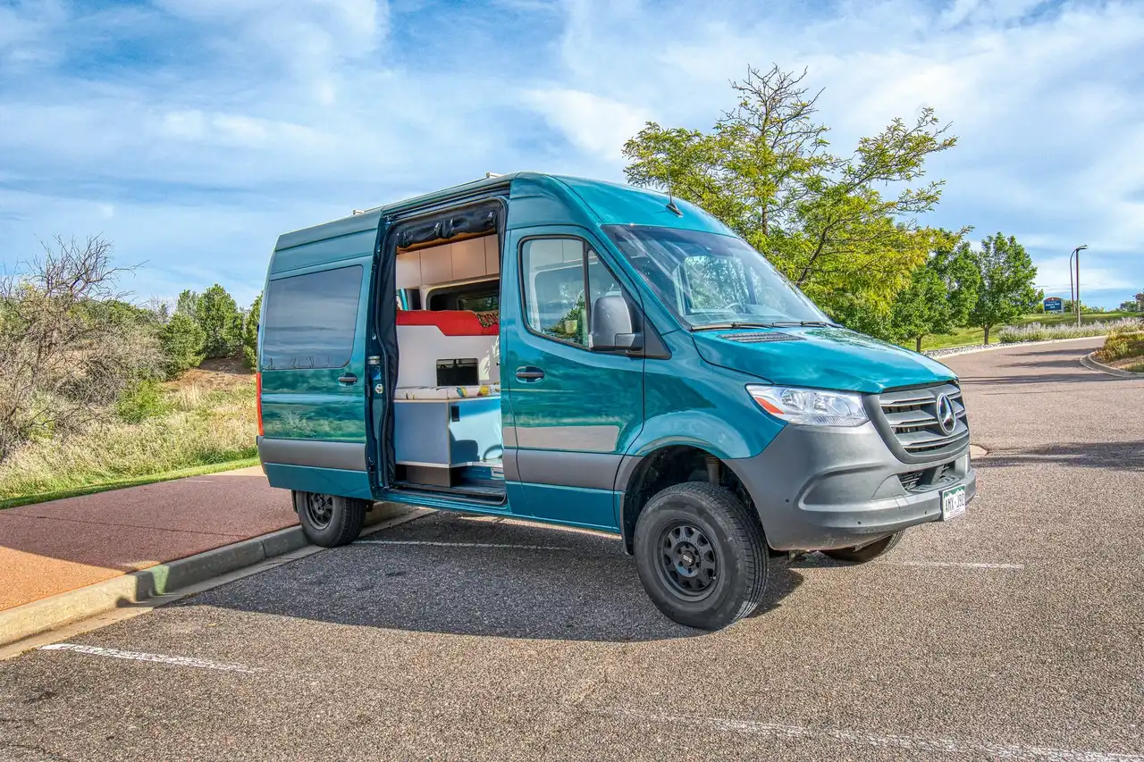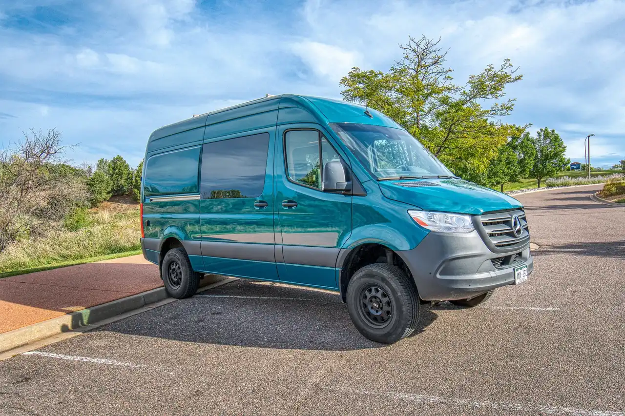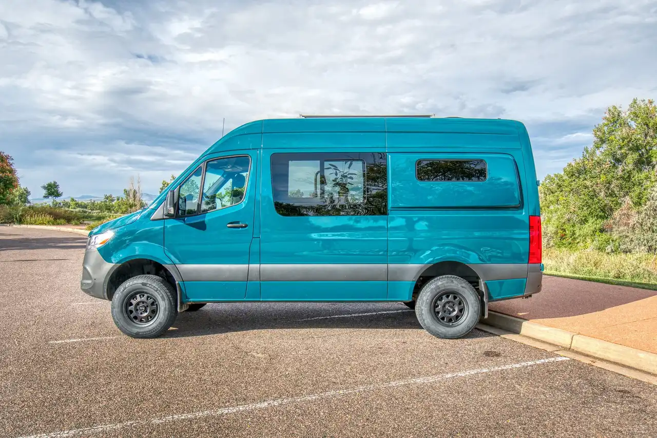 A 2021 Mercedes Sprinter 144" 4x4 with aqua green exterior and custom blue cabinetry, designed for extended living. The layout mirrors Vanlife Customs' Alpine Series Mesa Model, emphasizing a spacious interior with garage access via an open bulkhead. Features walnut butcher block countertops and a poplar tongue-and-groove ceiling.