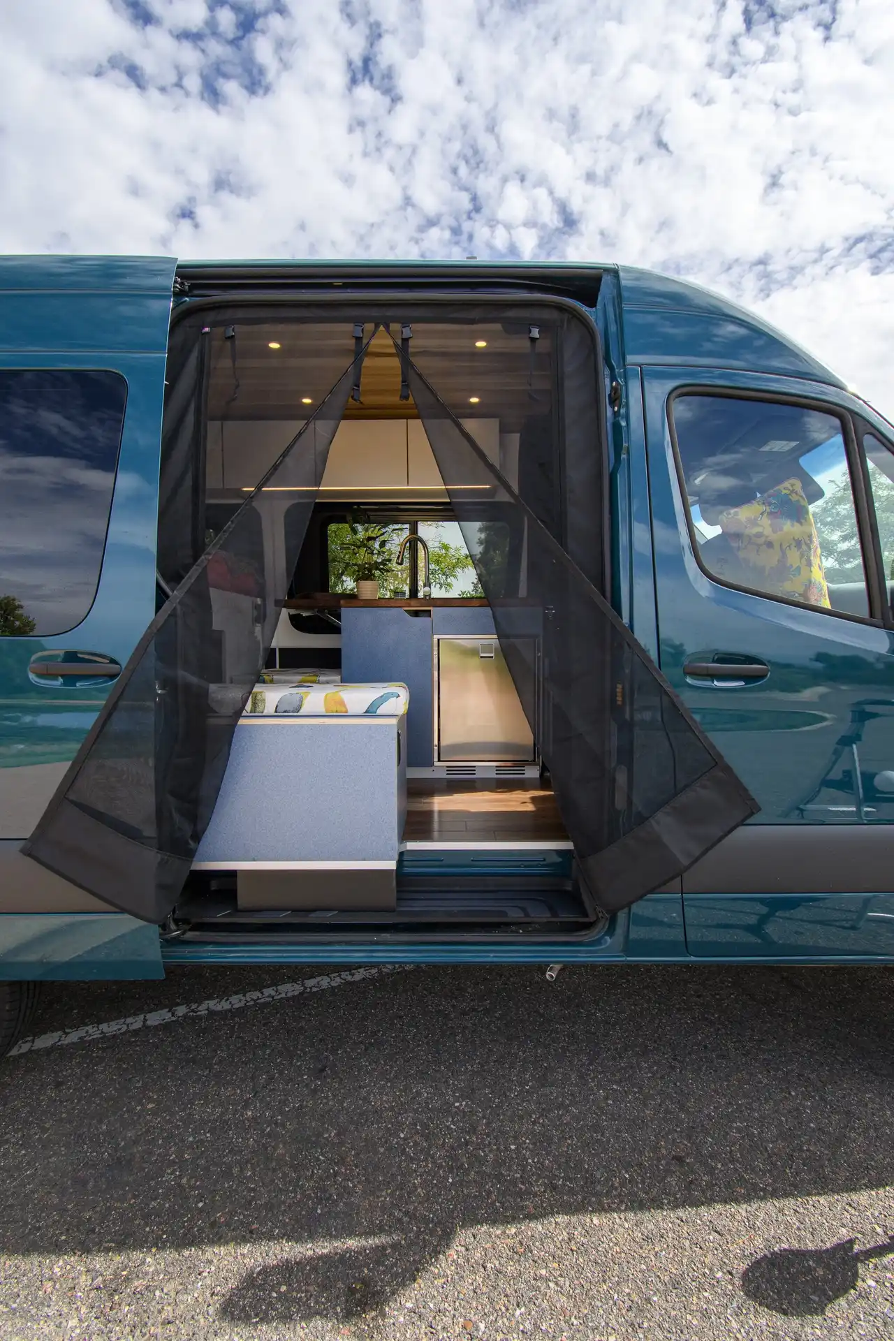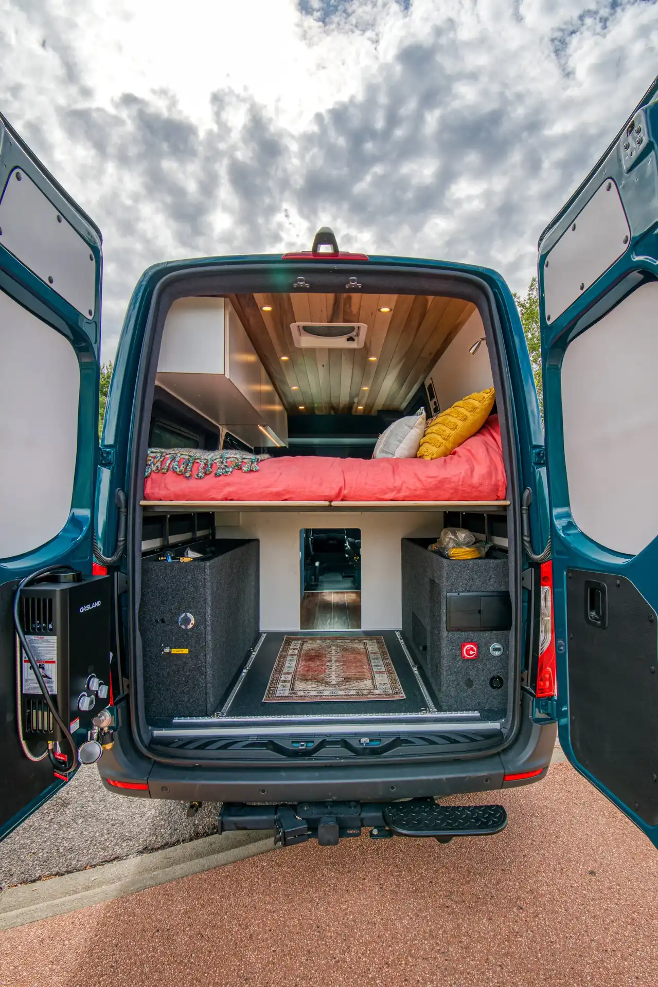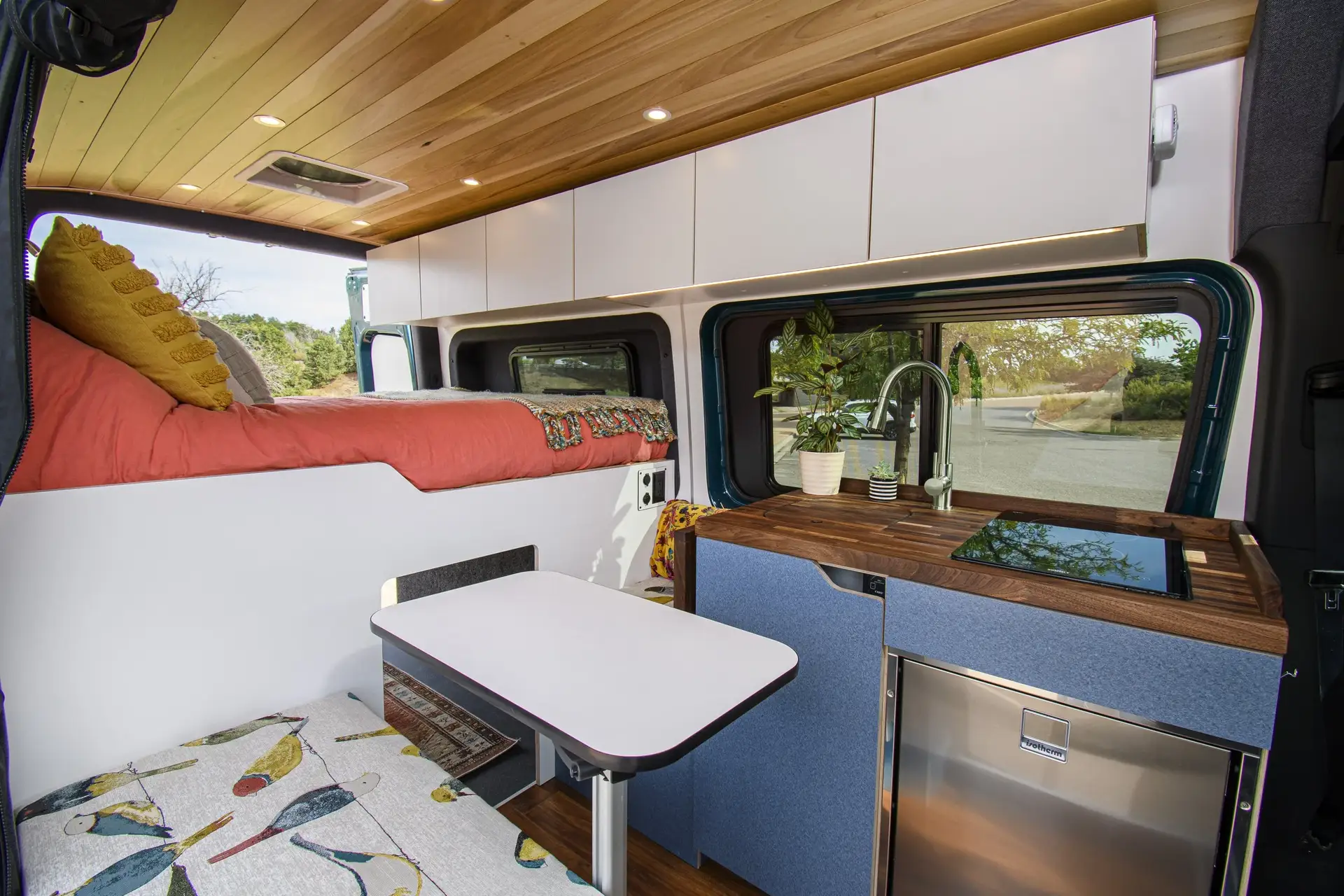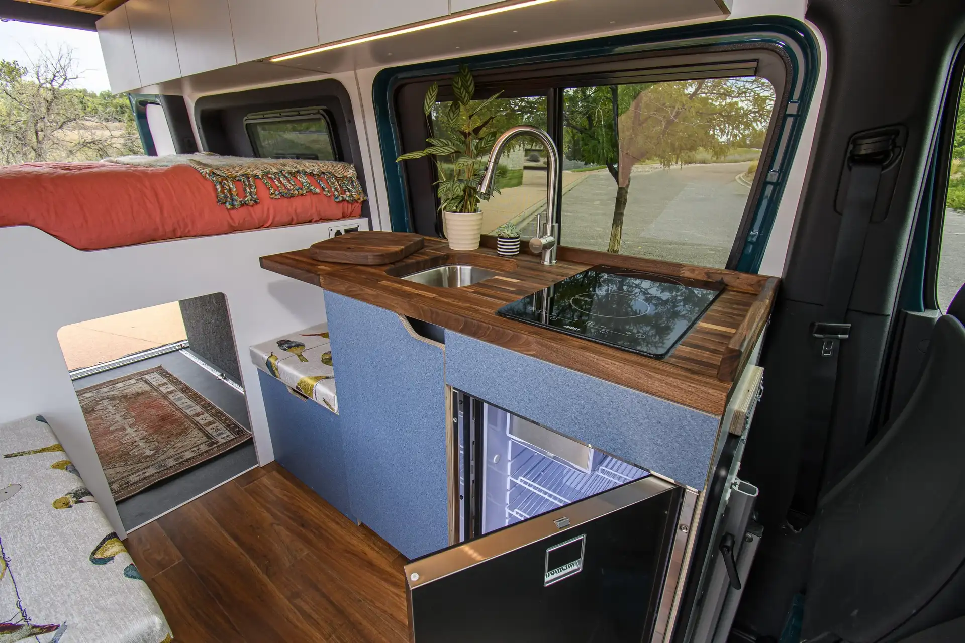 A 2021 Mercedes Sprinter 144" 4x4 with aqua green exterior and custom blue cabinetry, designed for extended living. The layout mirrors Vanlife Customs' Alpine Series Mesa Model, emphasizing a spacious interior with garage access via an open bulkhead. Features walnut butcher block countertops and a poplar tongue-and-groove ceiling.