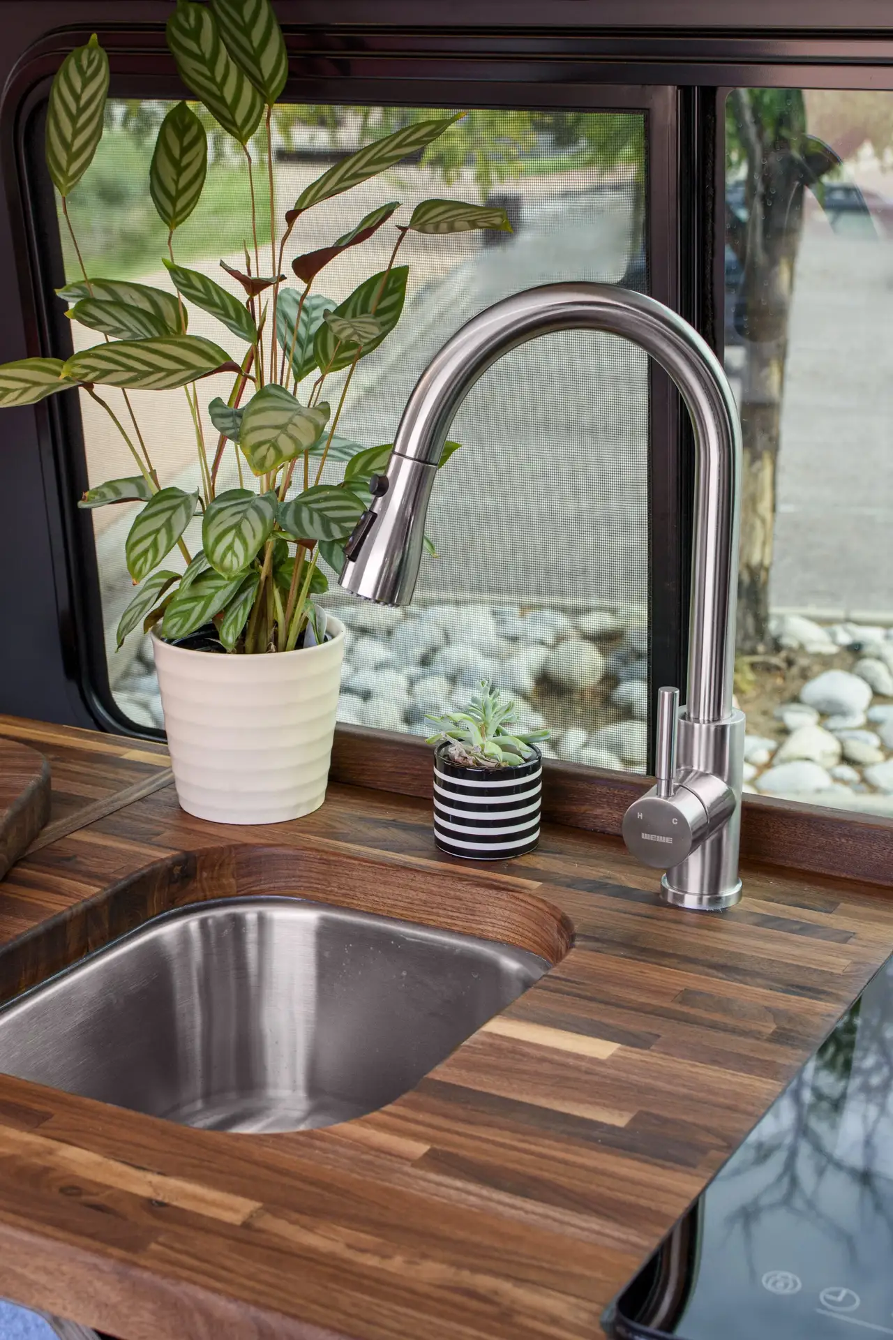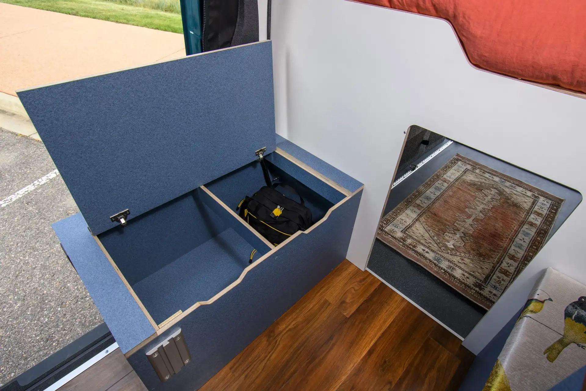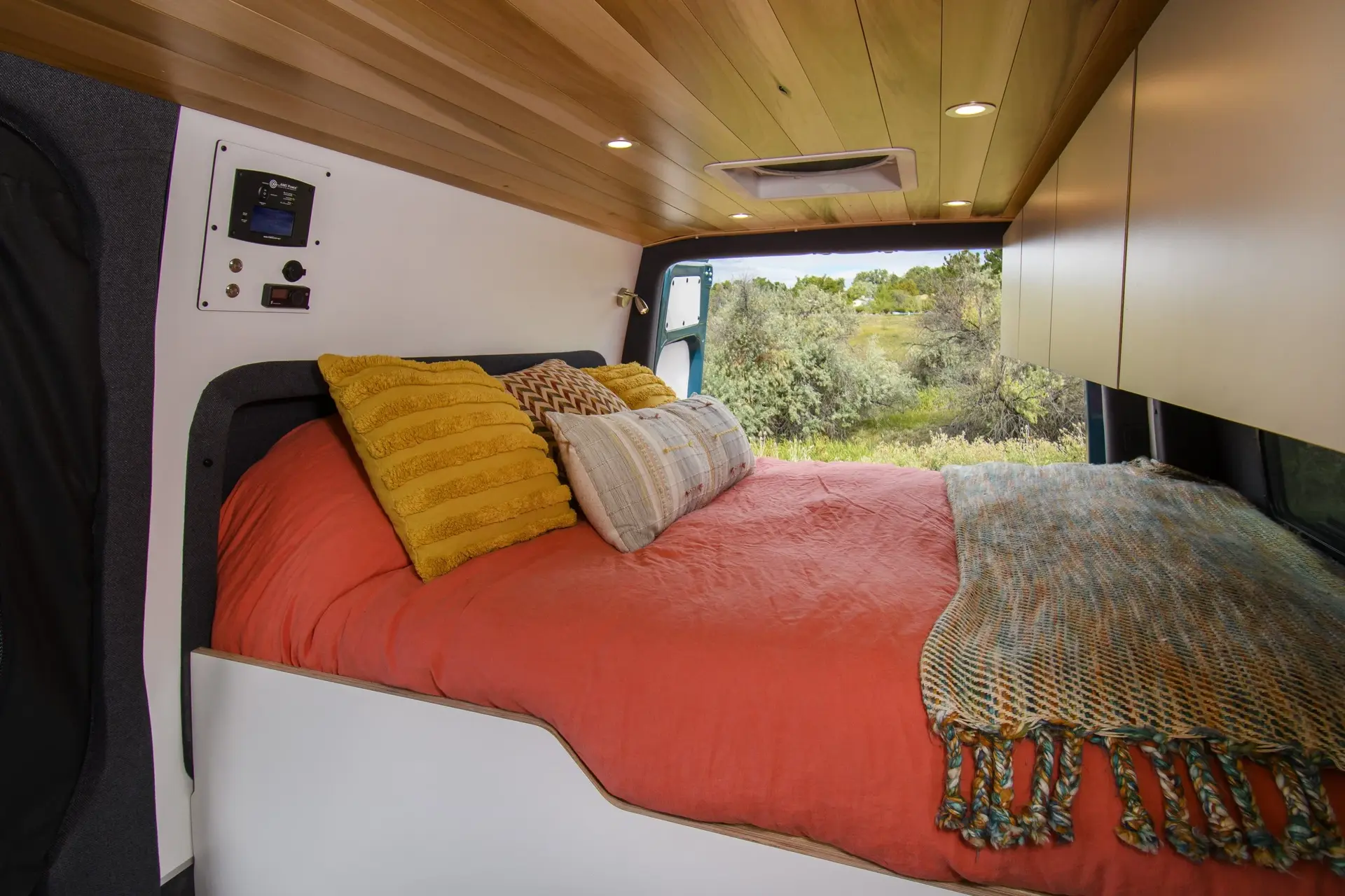Walnut butcher block countertop. Poplar T&G ceiling. Custom bench with cassette toilet. 3M Thinsulate insulation with sound dampening. Bluetooth battery/system monitoring.