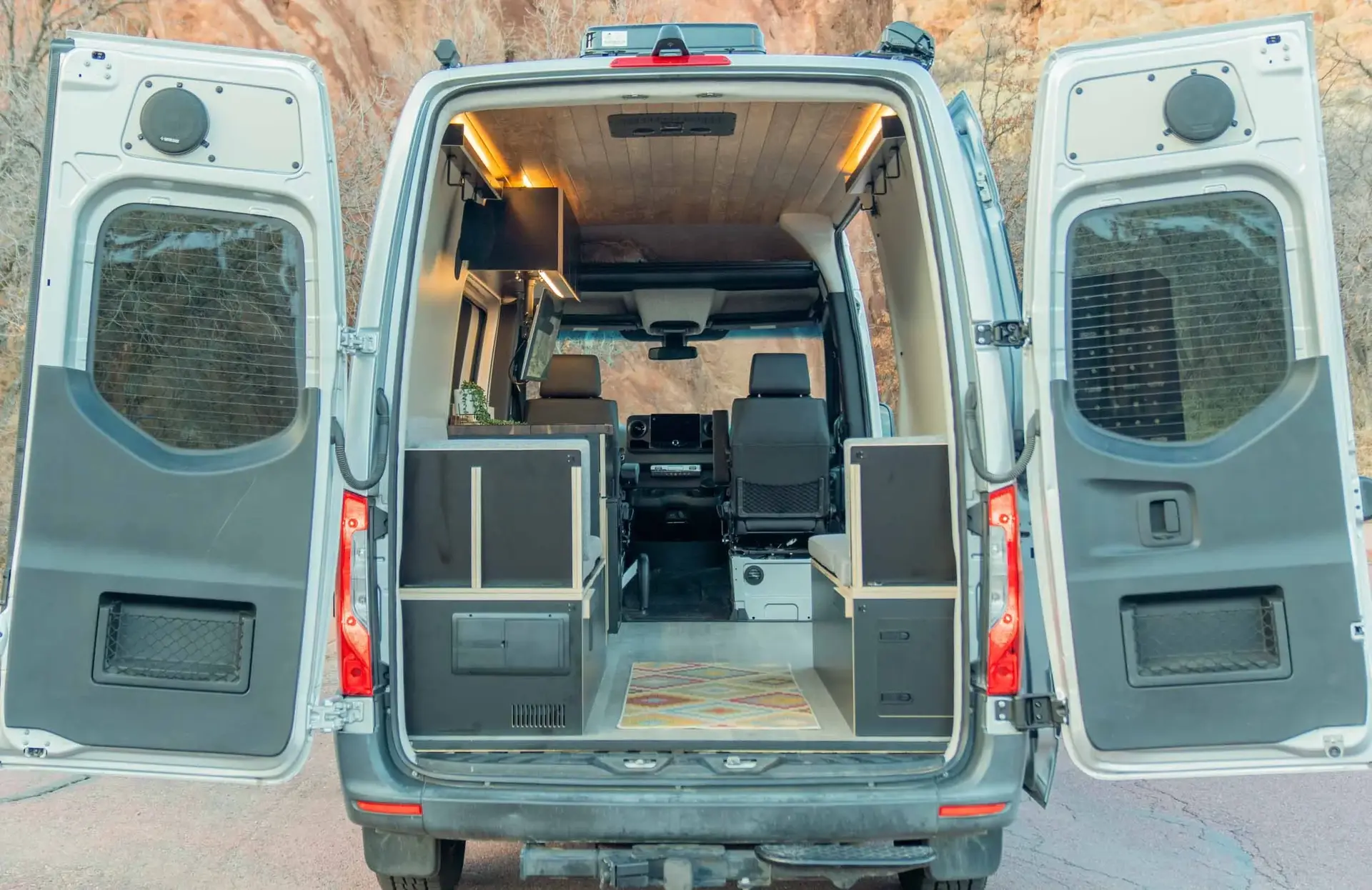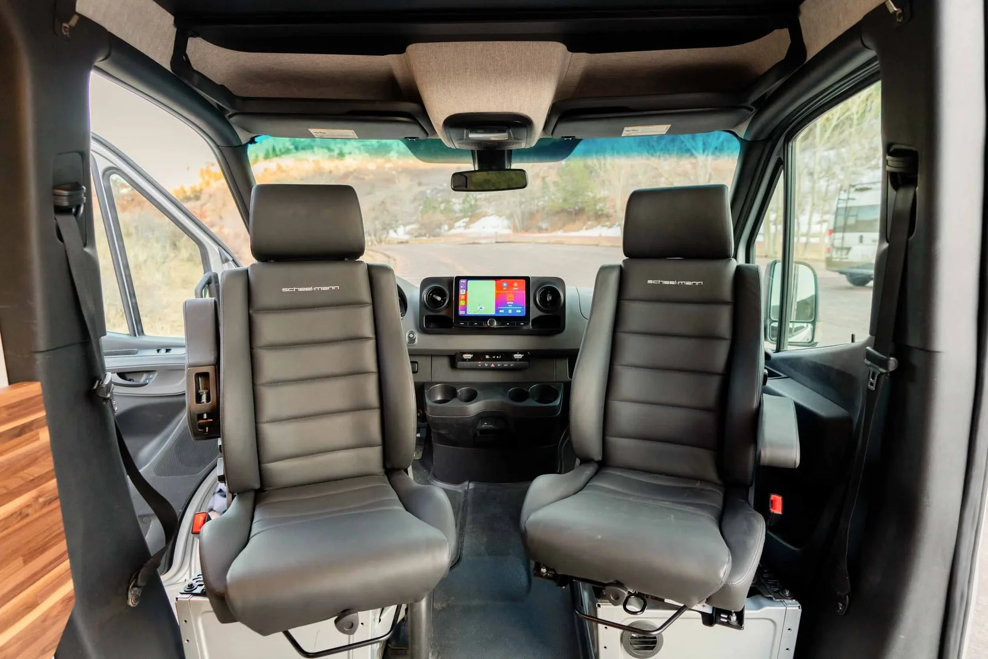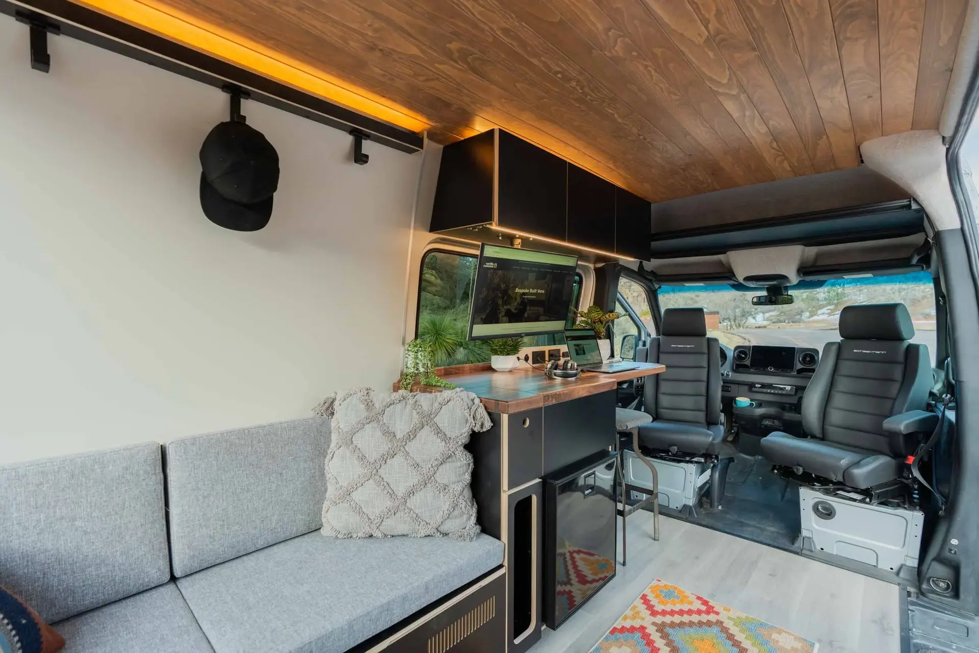 A 2022 Mercedes-Benz Sprinter 144" RWD converted into a mobile creative hub, VIP lounge, and adventure companion — commissioned by a Grammy-nominated musician. Features a convertible wrap-around lounge/bed for 8 people, a digital workstation, Scheel-Mann seat upgrades, and a massive 660Ah battery system. This is a 2WD creative studio, not a traditional campervan.