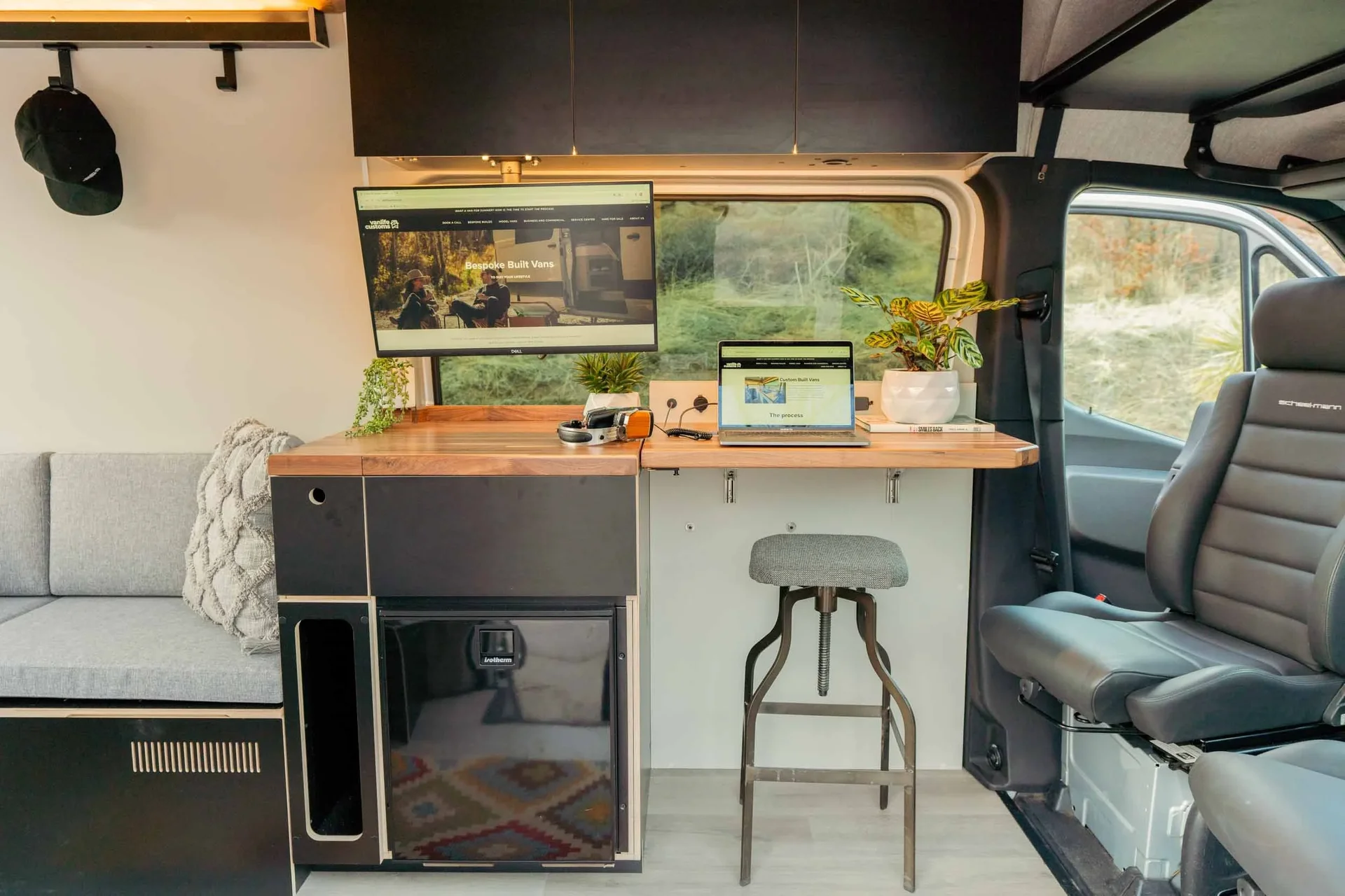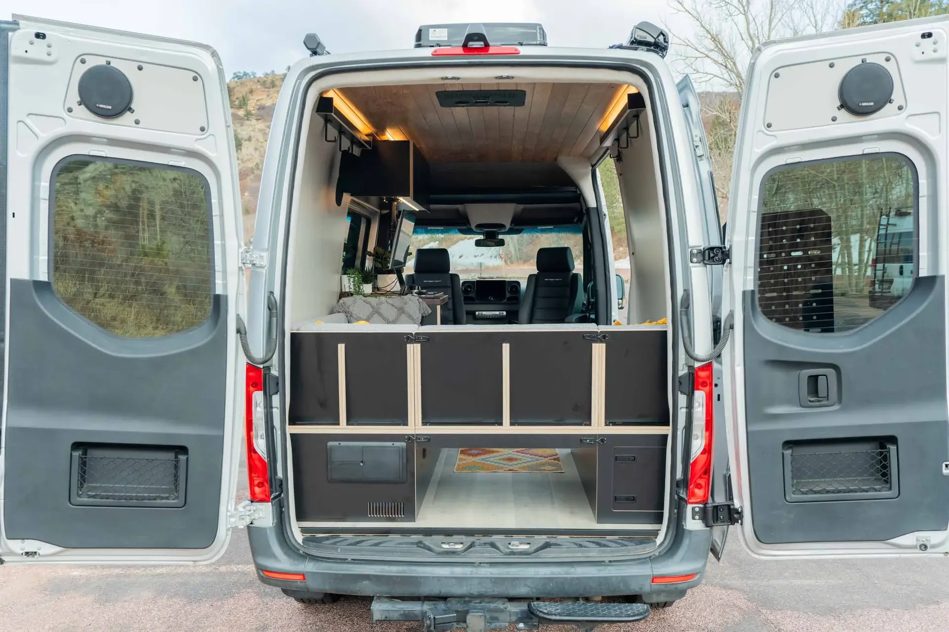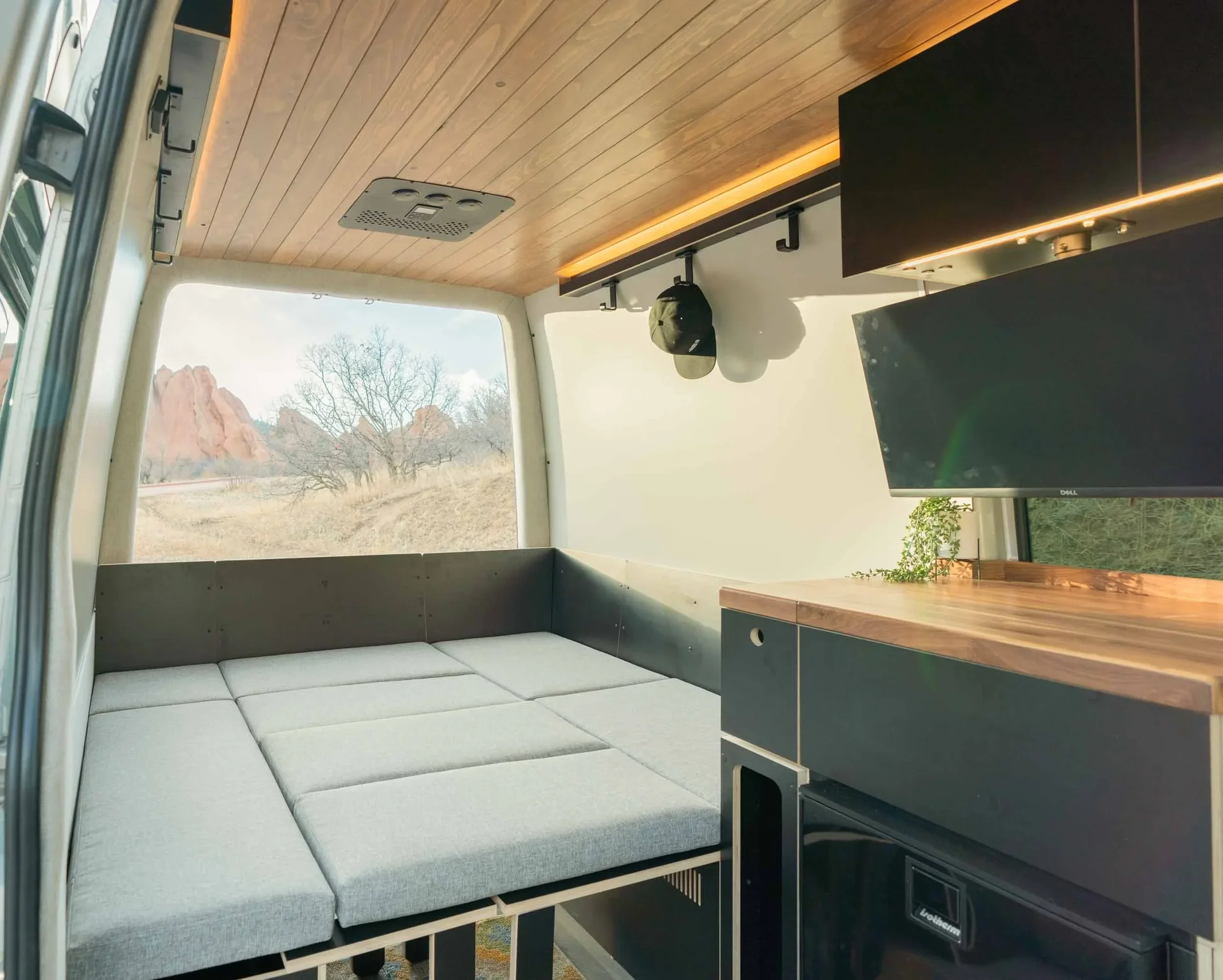 A 2022 Mercedes-Benz Sprinter 144" RWD converted into a mobile creative hub, VIP lounge, and adventure companion — commissioned by a Grammy-nominated musician. Features a convertible wrap-around lounge/bed for 8 people, a digital workstation, Scheel-Mann seat upgrades, and a massive 660Ah battery system. This is a 2WD creative studio, not a traditional campervan.
