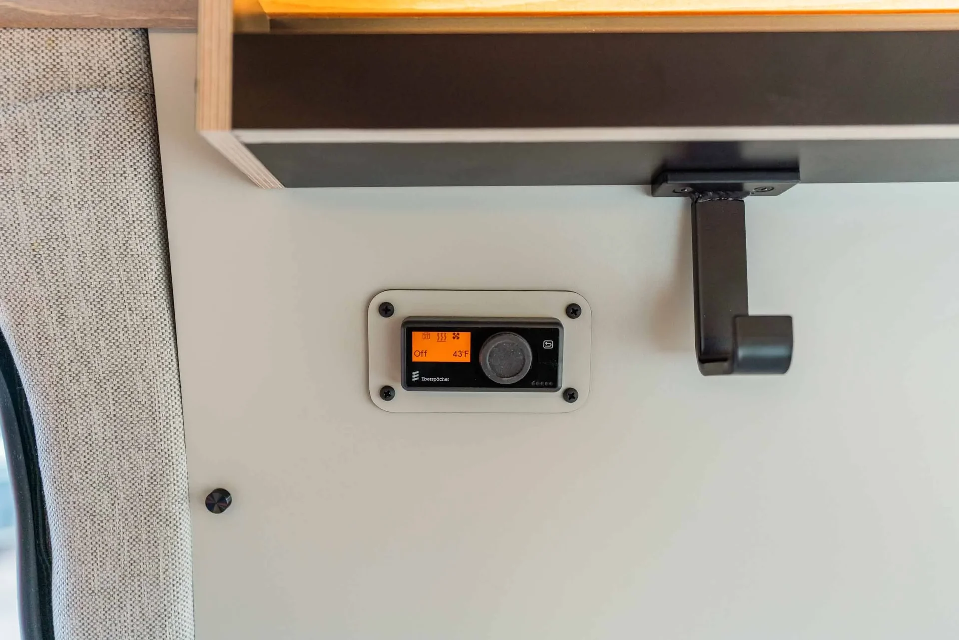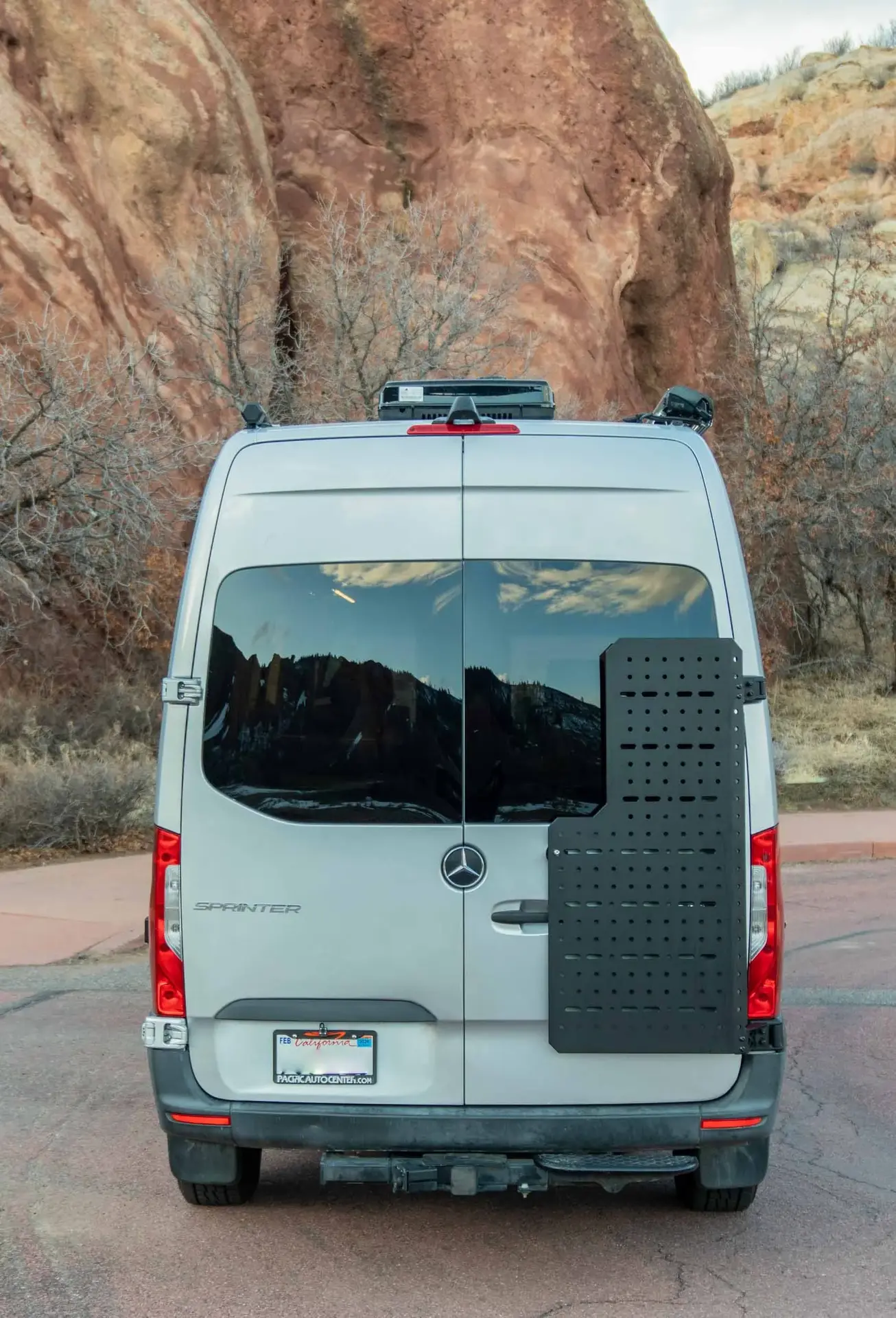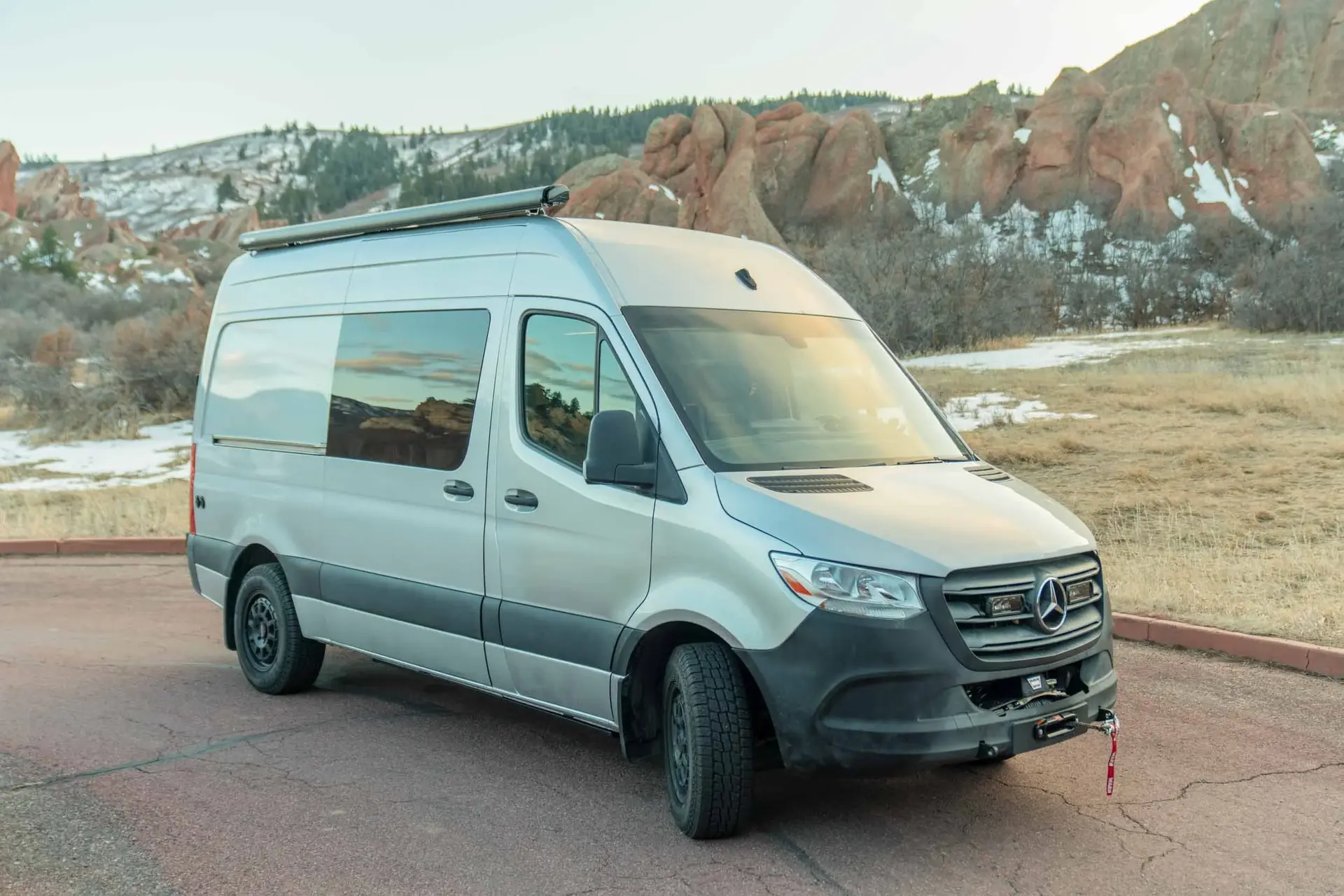 Van Compass Stage 4.3 suspension. AMP Research power step. Owl Vans Sherpa rear door rack with grill lights. Aluminess hidden winch mount with Warn winch. Fiamma F80s awning with lights.