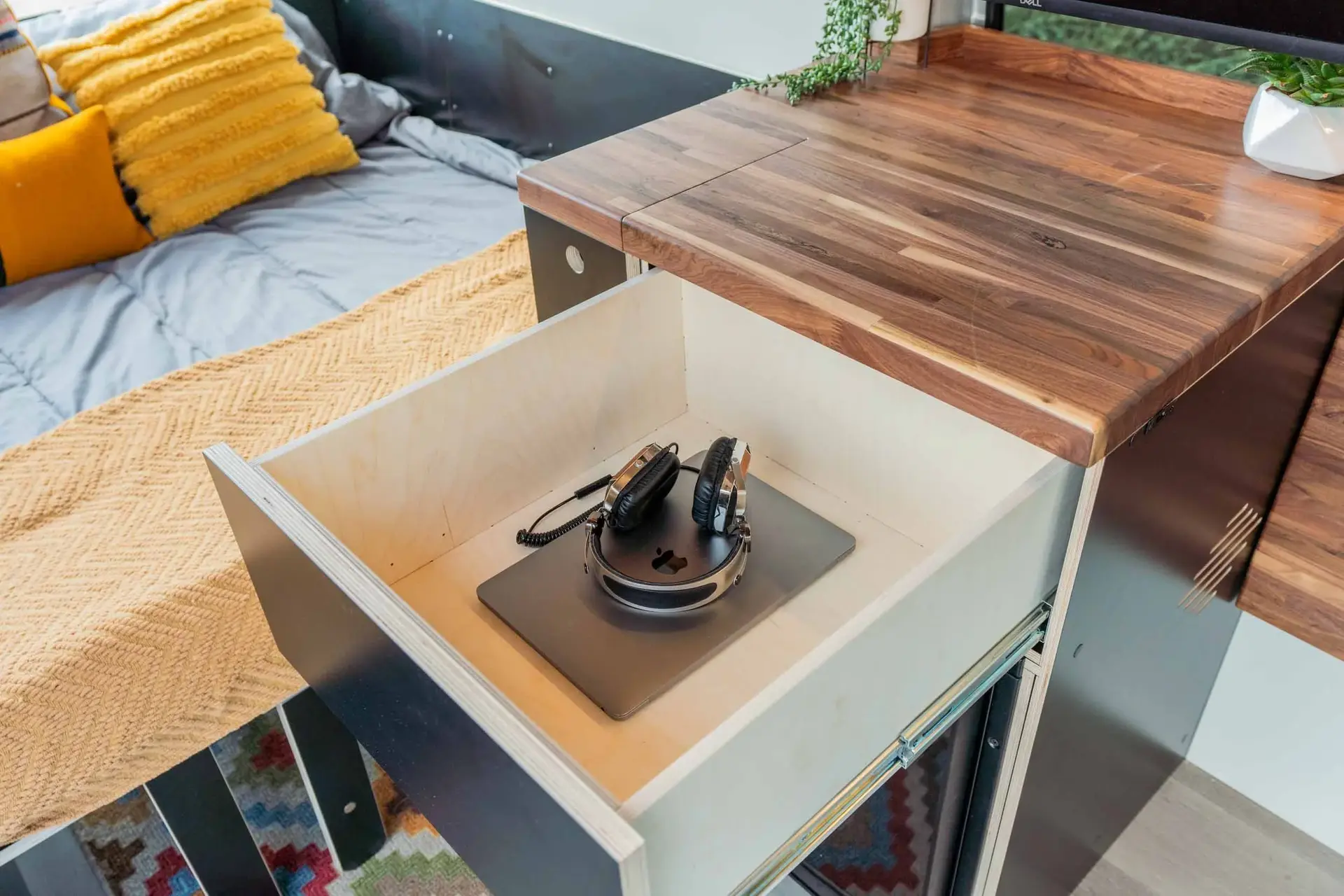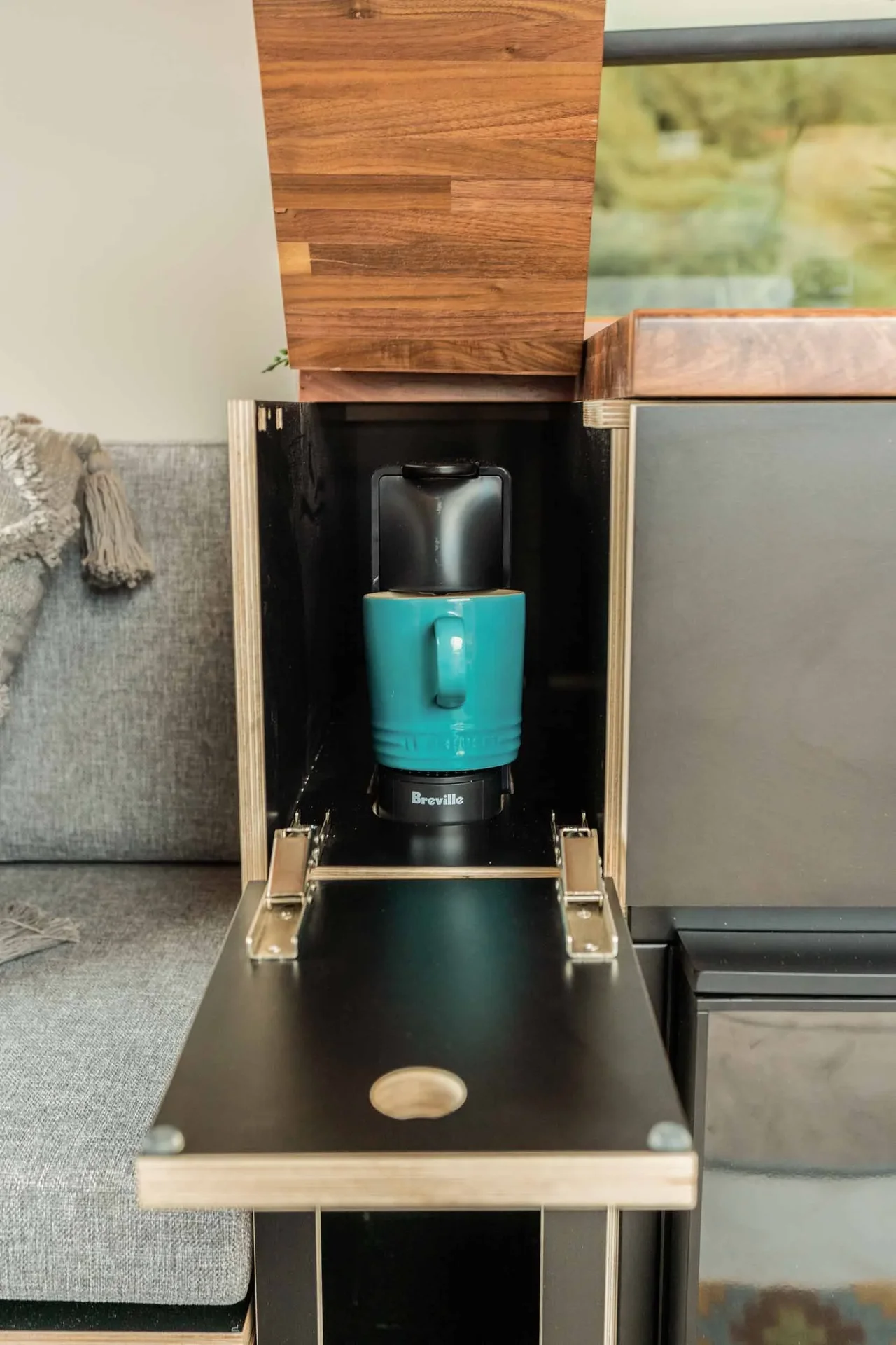 Walnut countertops. Tongue and groove ceiling. Flip-up digital workstation. Keurig coffee system. Convertible lounge for 8 people. Premium audio system with camera. WeBoost cell booster. 3M Thinsulate insulation.